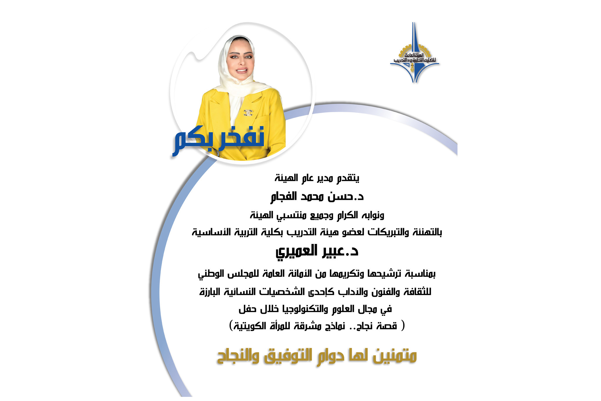 تهنئة وتبريكات لعضو هيئة التدريب بكلية التربية الاساسية د.عبير العميري