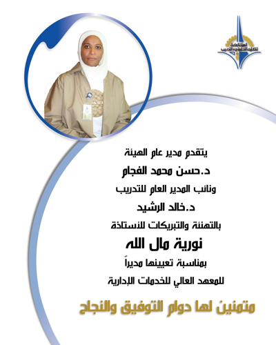 تهنئة للأستاذة نورية مال الله بمناسبة تعيينها مديرا للمعهد العالي للخدمات الإدارية