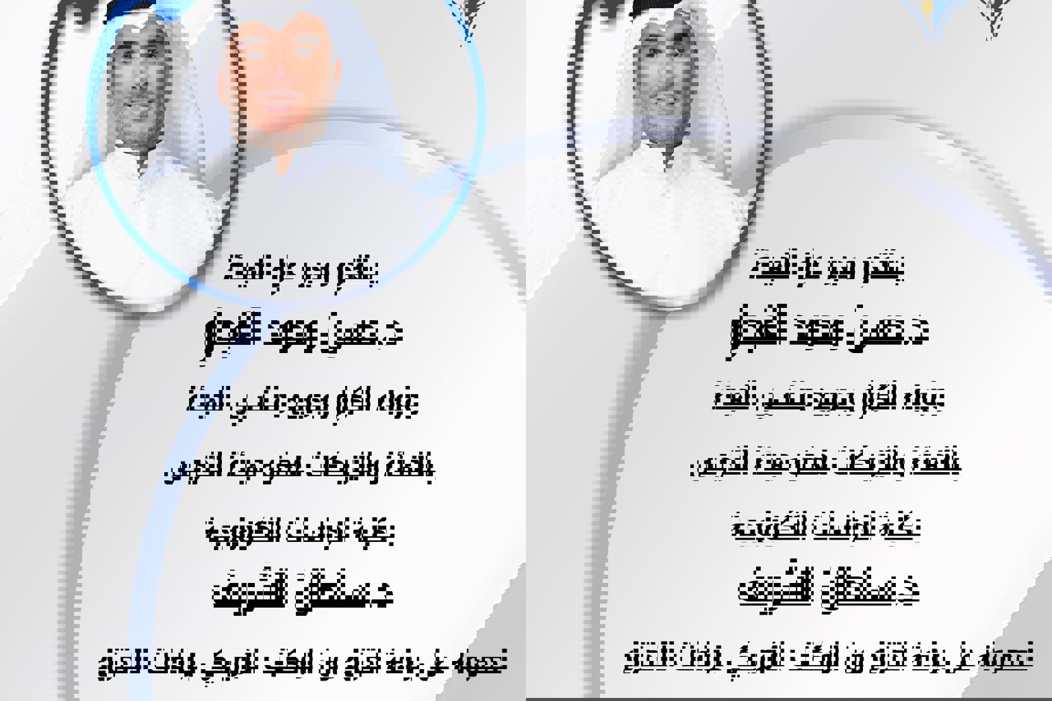 يتقدم مدير عام الهيئة د.حسن محمد الفجام ونوابه الكرام وجميع منتسبي الهيئة بالتهنئة والتبريكات لعضو هيئة التدريس بكلية الدراسات التكنولوجية د.سلطان الشريف لحصوله على براءة اختراع من المكتب الأميركي...