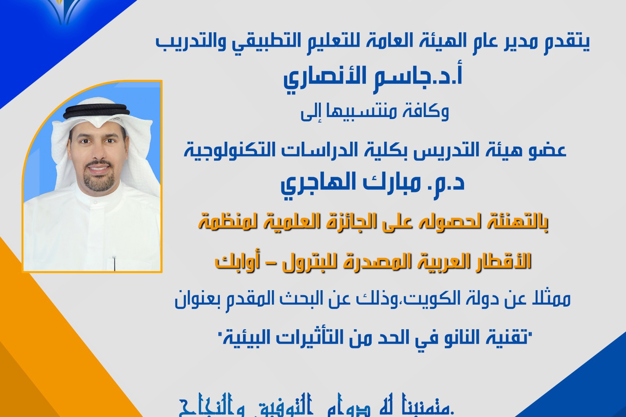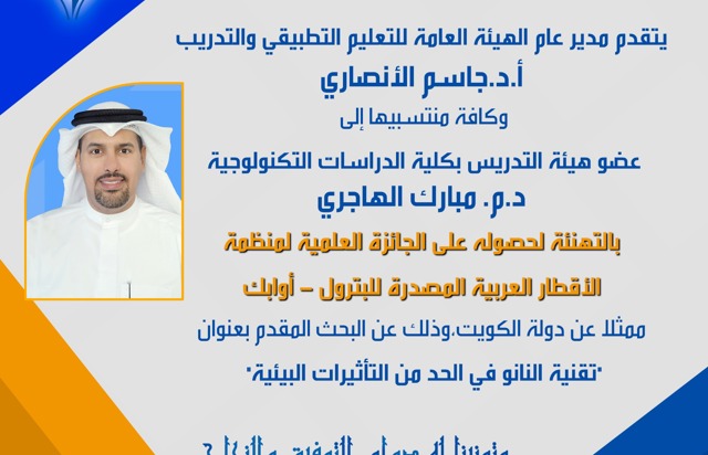 يتقدم مدير عام الهيئة العامة للتعليم التطبيقي والتدريبأ.د.جاسم الأنصاري، وكافة منتسبيها إلى عضو هيئة التدريسبكلية الدراسات التكنولوجية د.م. مبارك الهاجري بالتهنئةلحصوله على الجائزة العلمية لمنظمة...