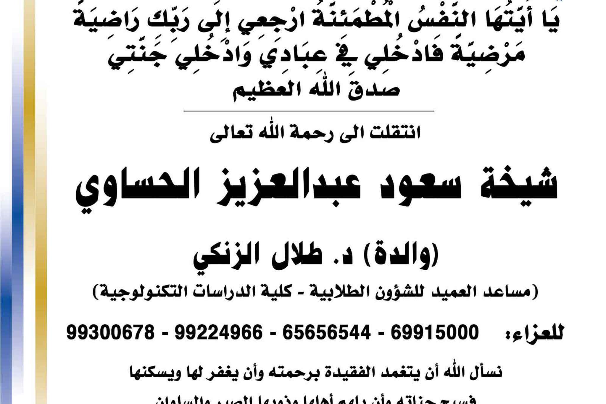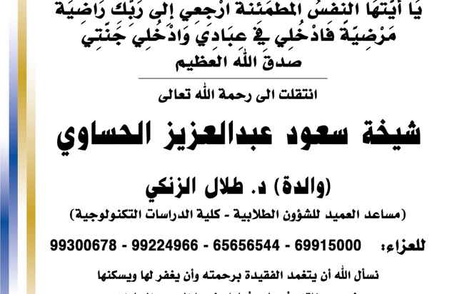 بسم الله الرحمن الرحيم يا آيتها النفس المطمئنة ارجعي الى ربك راضية مرضية فادخلي في عبادي وأدخلي جنتي صدق الله العظيم انتقلت الى رحمه الله تعالى والدة د.طلال الزنكي ( شيخة سعود عبدالعزيز...