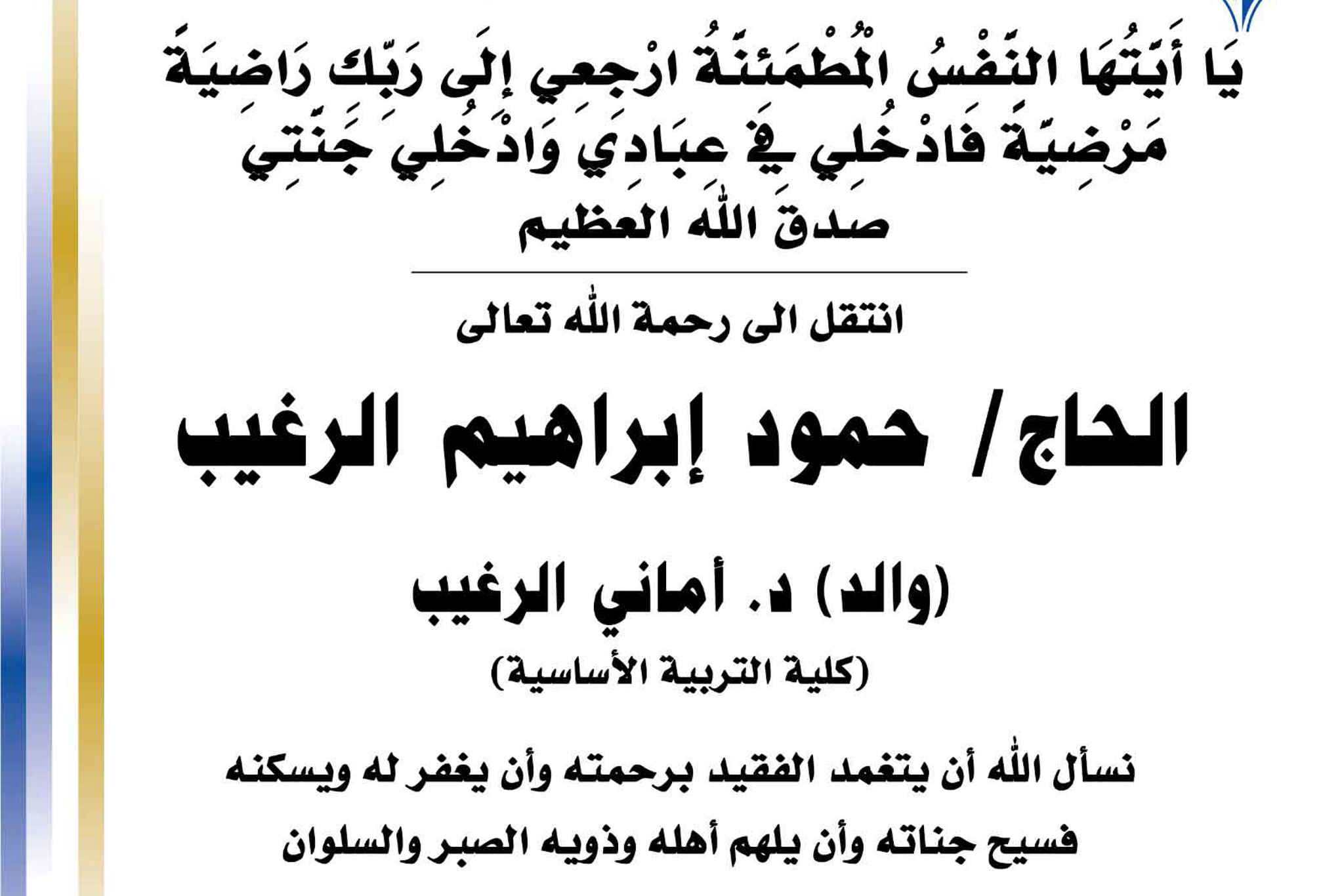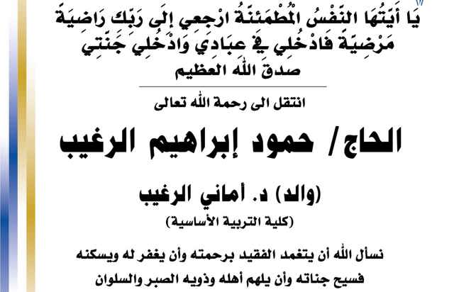 بسم الله الرحمن الرحيم يا آيتها النفس المطمئنة ارجعي الى ربك راضية مرضية فادخلي في عبادي وأدخلي جنتي صدق الله العظيم انتقل الى رحمه الله تعالى الحاج / حمود ابراهيم الرغيب والد د.أماني...