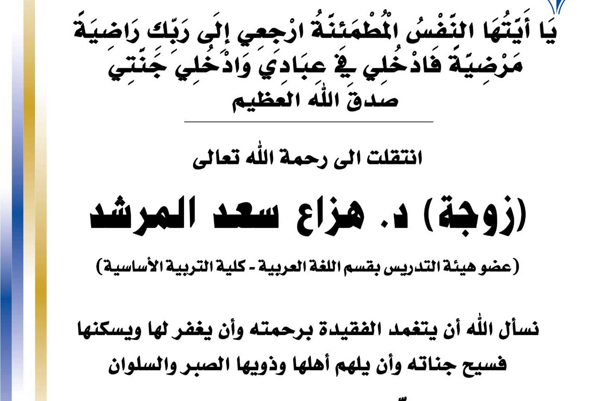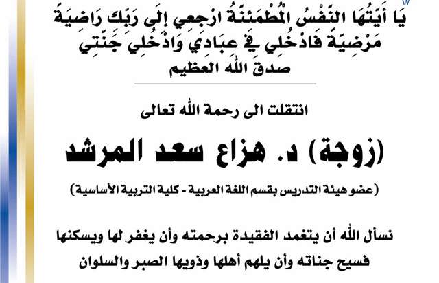 بسم الله الرحمن الرحيم يا آيتها النفس المطمئنة ارجعي الى ربك راضية مرضية فادخلي في عبادي وأدخلي جنتي صدق الله العظيم انتقلت الى رحمه الله تعالى زوجة د.هزاع سعد المرشد عضو هيئة التدريس بقسم...