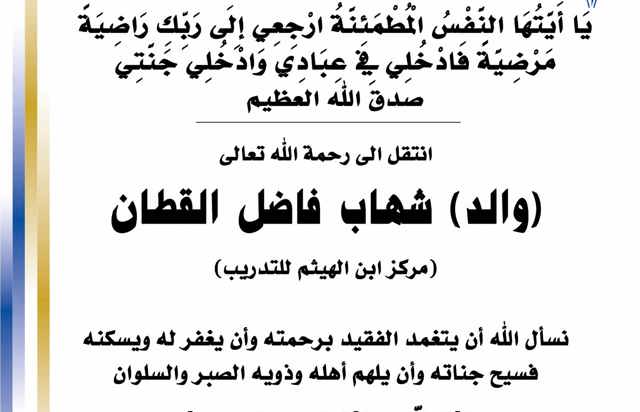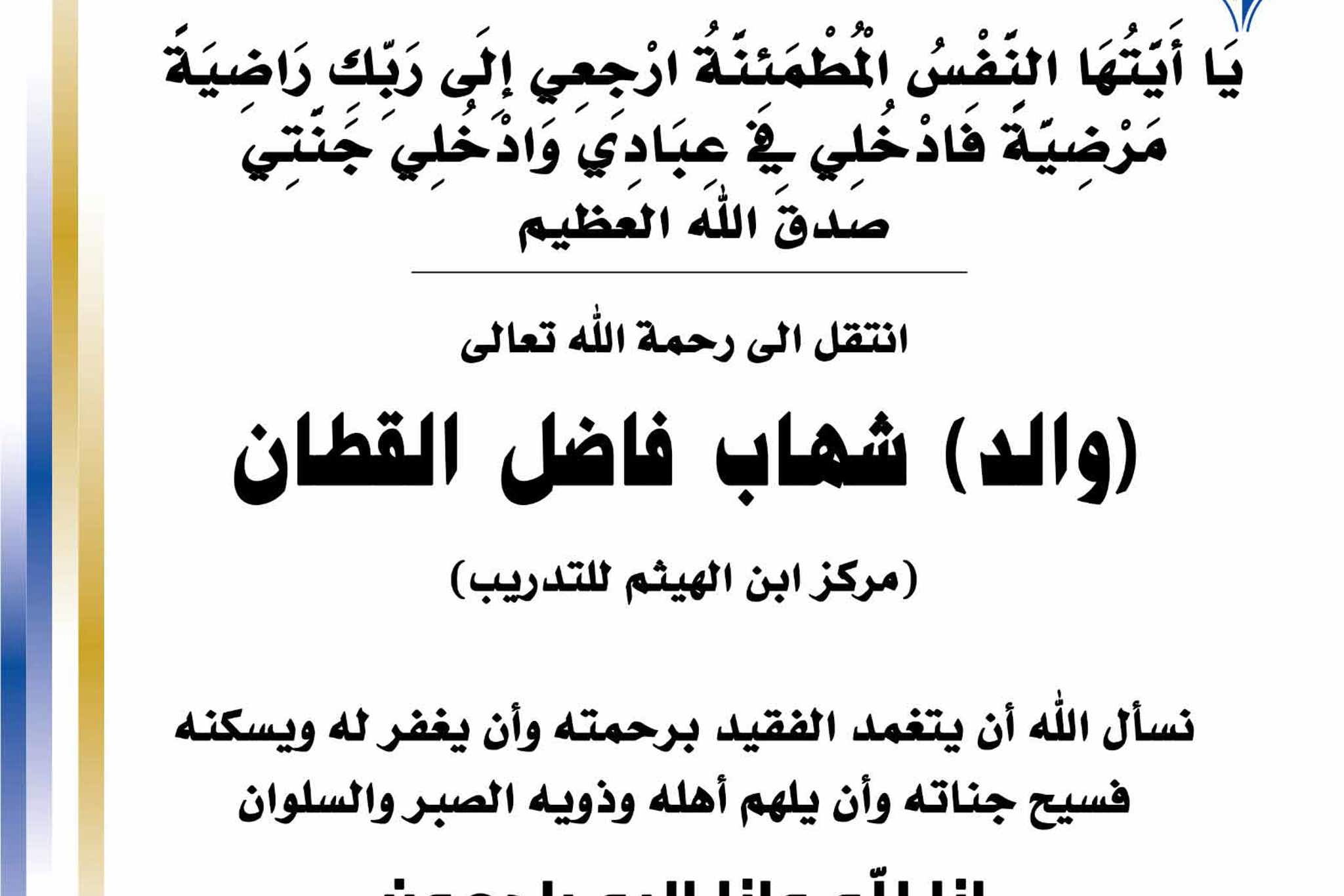 بسم الله الرحمن الرحيم يا آيتها النفس المطمئنة ارجعي الى ربك راضية مرضية فادخلي في عبادي وأدخلي جنتي صدق الله العظيم انتقل الى رحمه الله تعالى والد شهاب فاضل القطان مركز ابن الهيثم للتدريب.