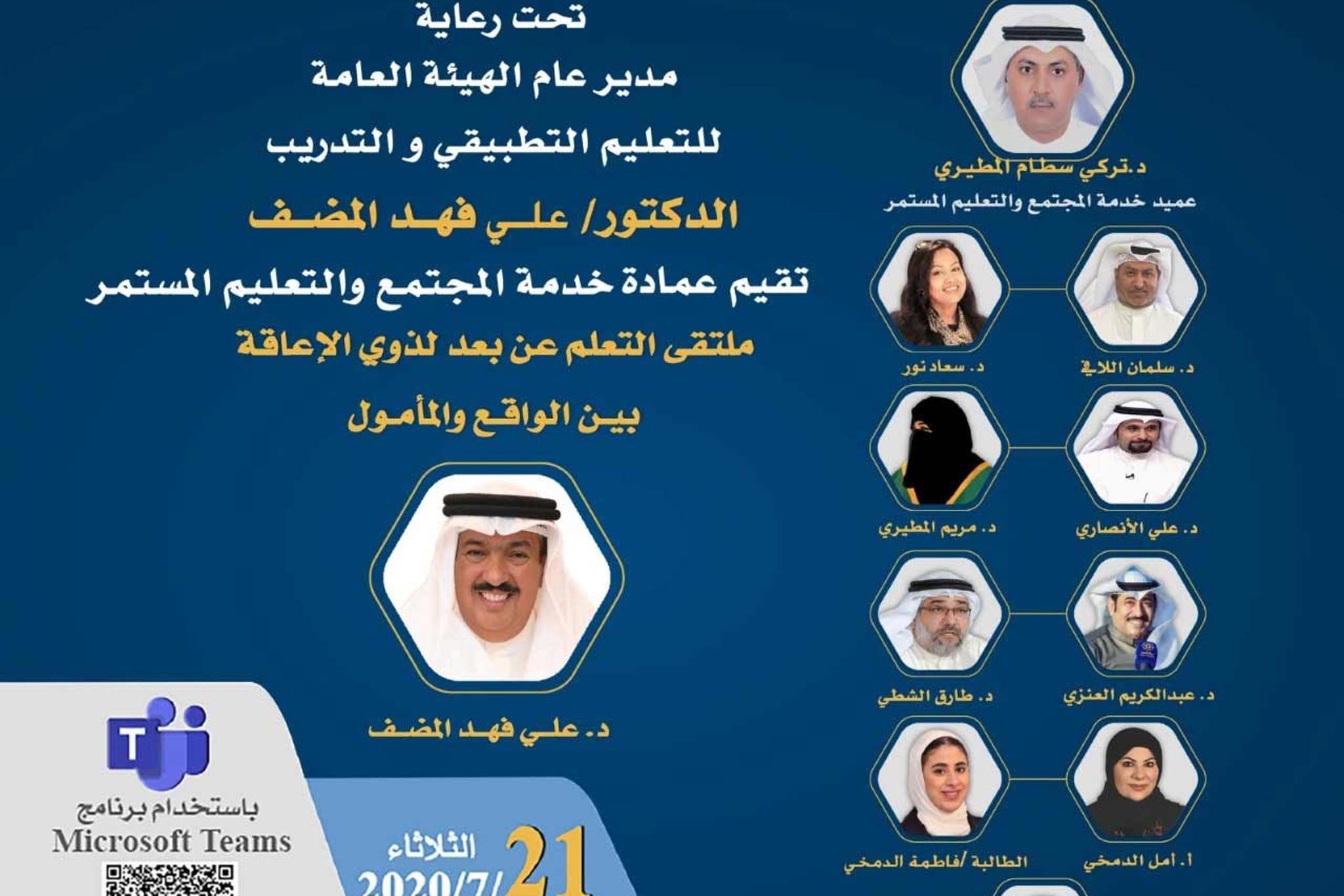 تحت رعاية مدير عام الهيئة العامة للتعليم التطبيقي والتدريب د.علي المضف تنظم عمادة خدمة المجتمع والتعليم المستمر ملتقى " التعليم عن بعد لذوي الإعاقة بين الواقع والمأمول " وذلك عبر منصة مايكروسوفت...