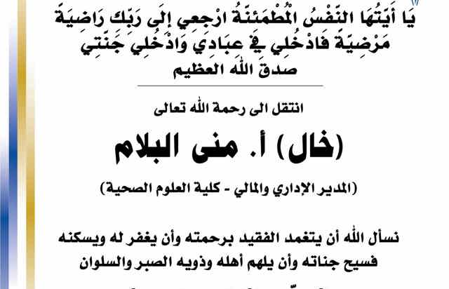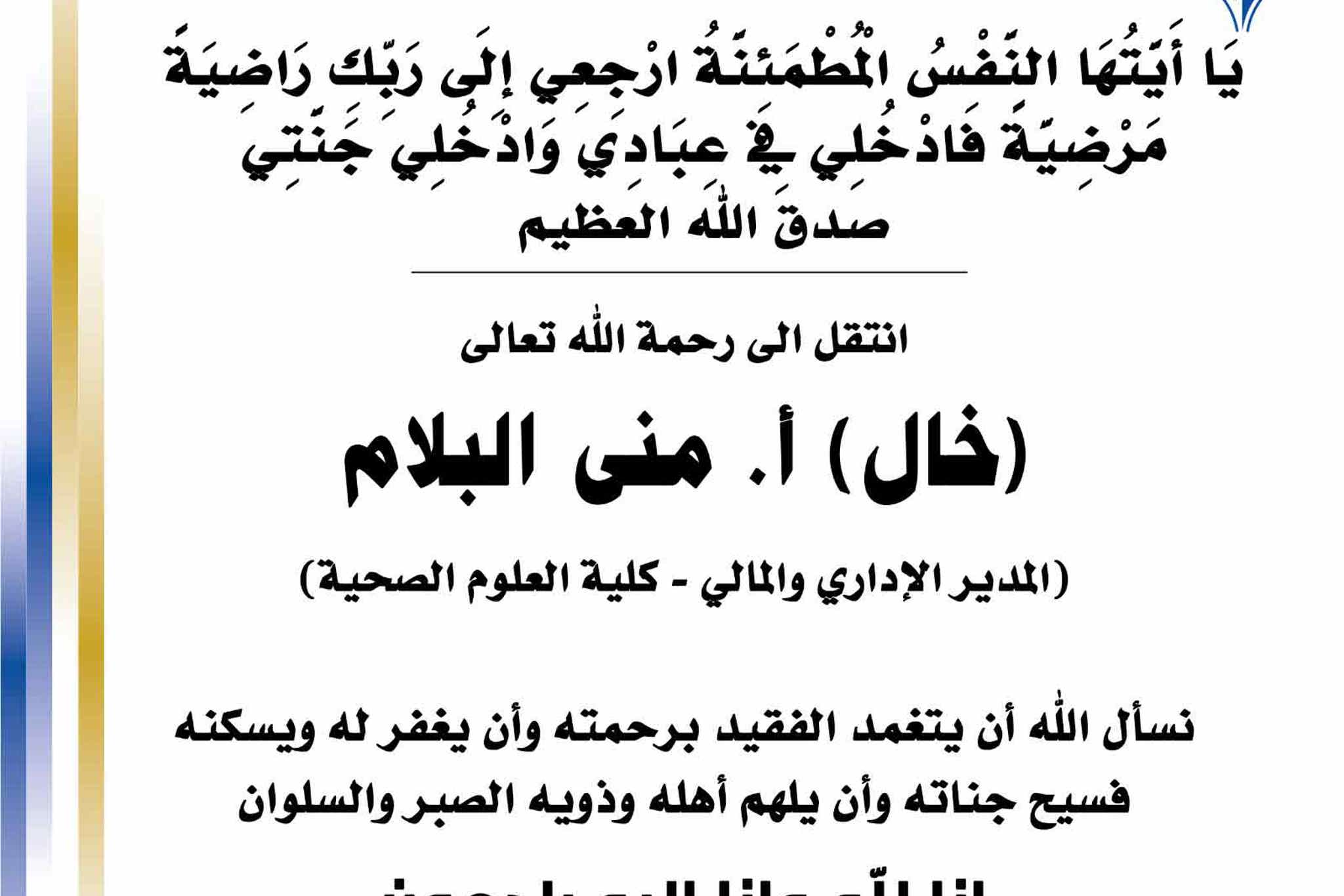 بسم الله الرحمن الرحيم يا آيتها النفس المطمئنة ارجعي الى ربك راضية مرضية فادخلي في عبادي وأدخلي جنتي صدق الله العظيم انتقل الى رحمه الله تعالى خال أ. منى البلام المدير الاداري والمالي - كلية...