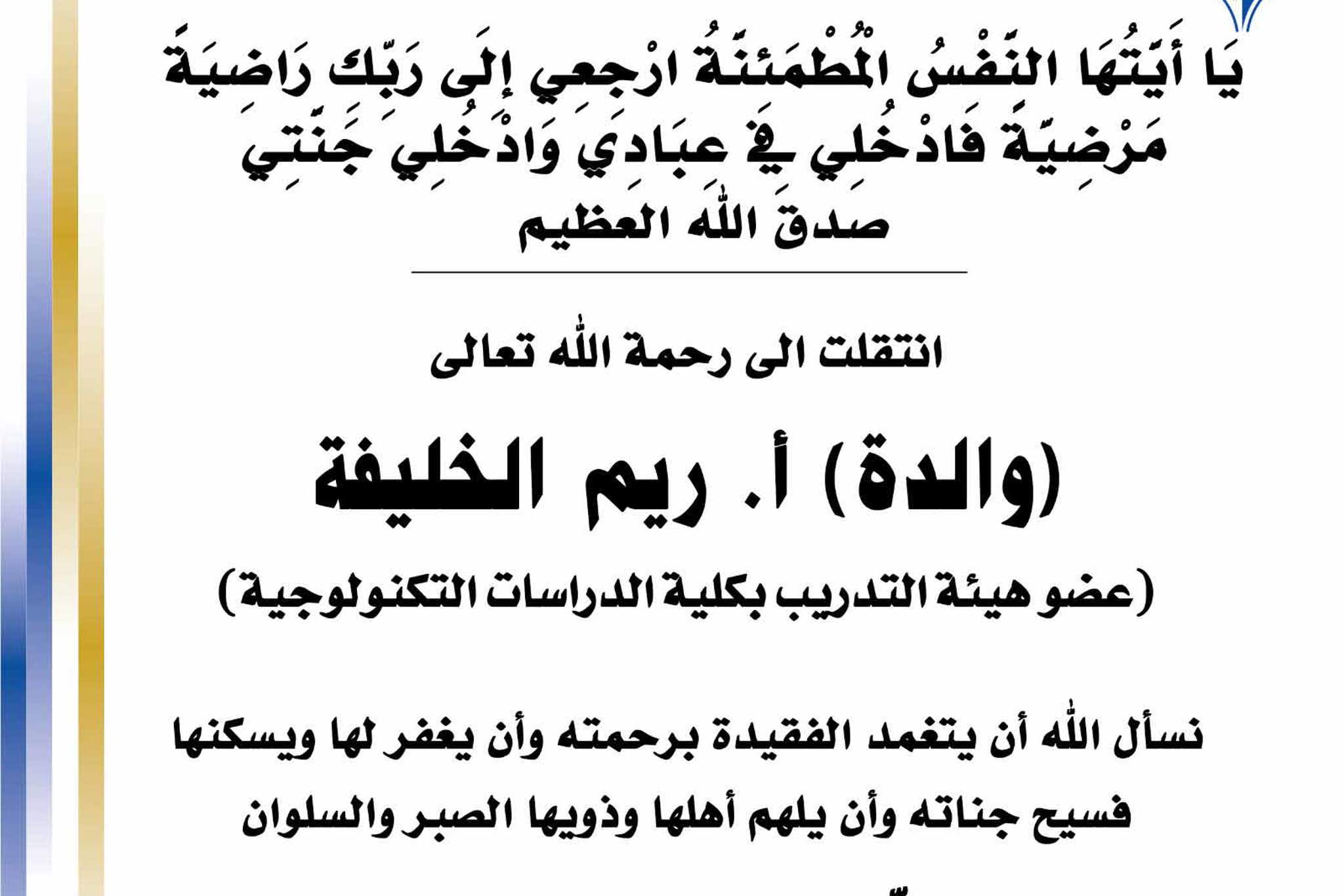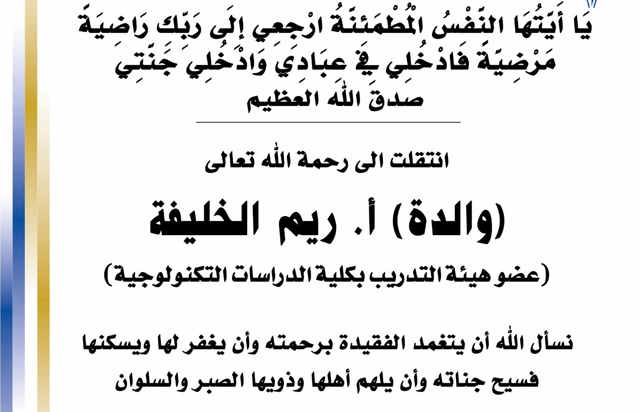 بسم الله الرحمن الرحيم يا آيتها النفس المطمئنة ارجعي الى ربك راضية مرضية فادخلي في عبادي وأدخلي جنتي صدق الله العظيم انتقلت الى رحمه الله تعالى والدة أ. ريم الخليفة عضو هيئة التجريب بكلية...