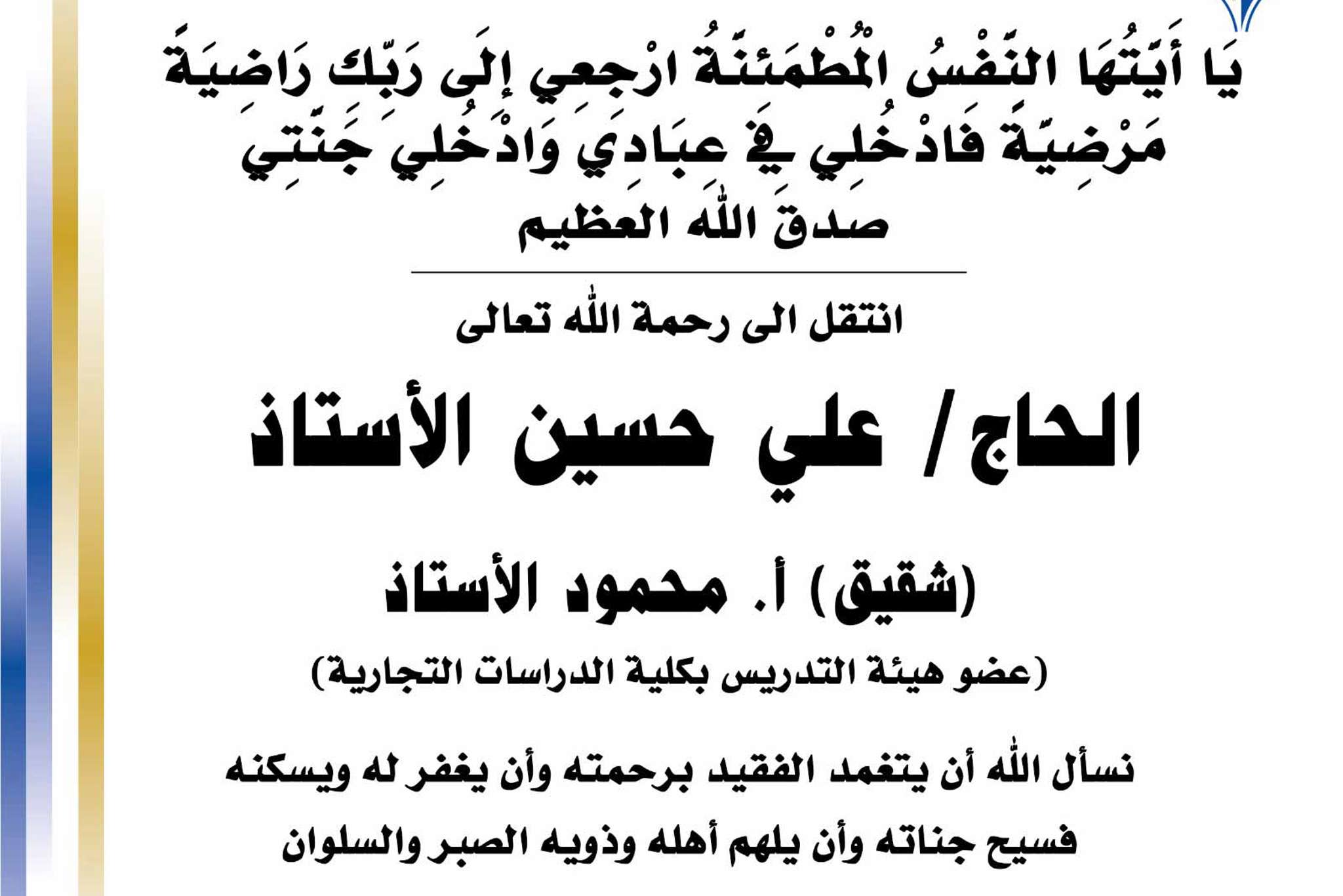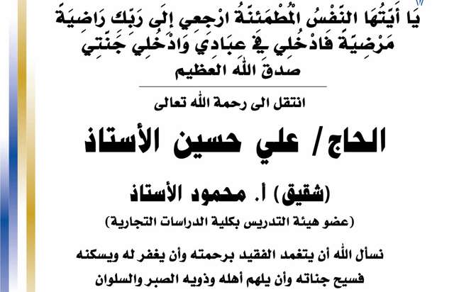 بسم الله الرحمن الرحيم يا آيتها النفس المطمئنة ارجعي الى ربك راضية مرضية فادخلي في عبادي وأدخلي جنتي صدق الله العظيم انتقل الى رحمه الله تعالى الحاج / علي حسين الاستاذ شقيق أ.محمود الاستاذ عضو...