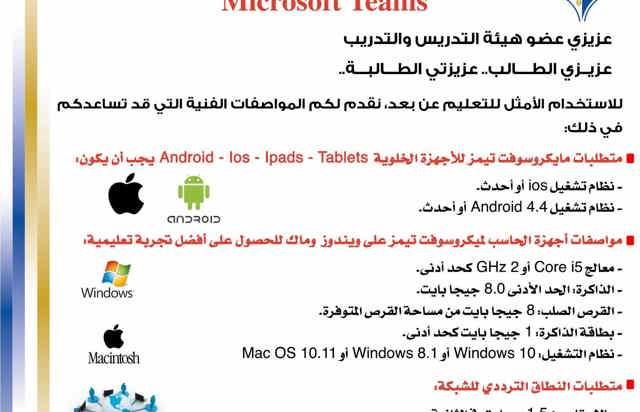 متطلبات نظام مايكروسوفت تيمز لاعضاء هيئة التدريس والتدريب وطلبة الهيئة