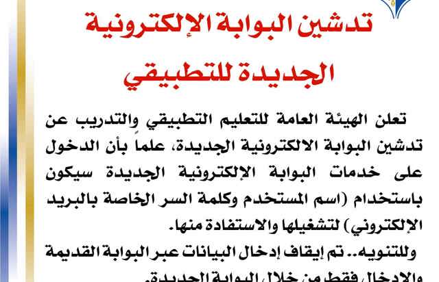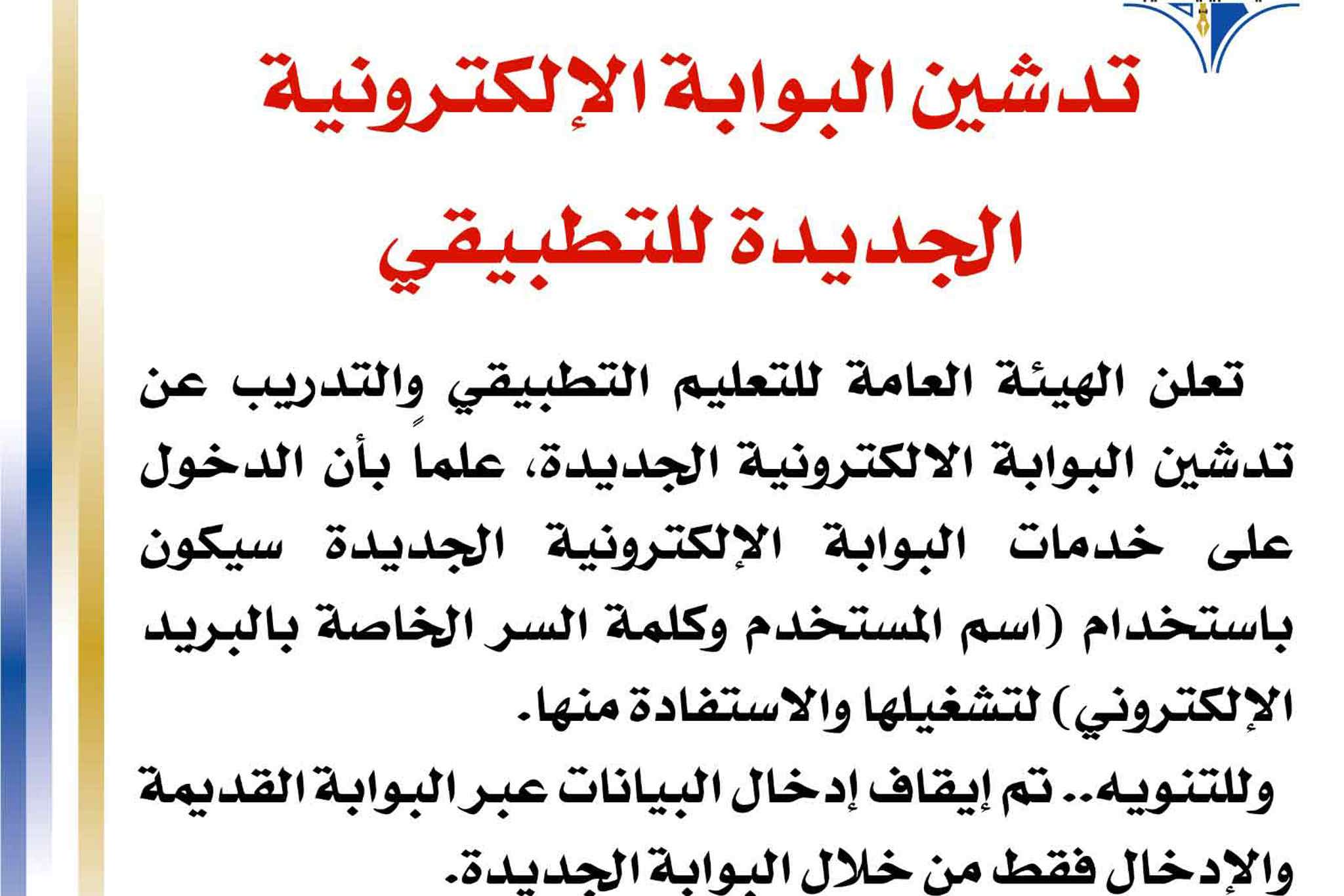 تعلن الهيئة العامة للتعليم التطبيقي والتدريب عن تدشين البوابة الالكترونية الجديدة ، علماً بأن الدخول على خدمات البوابة الالكترونية الجديدة سيكون باستخدام اسم المستخدم وكلمة السر الخاصة بالبريد...