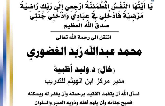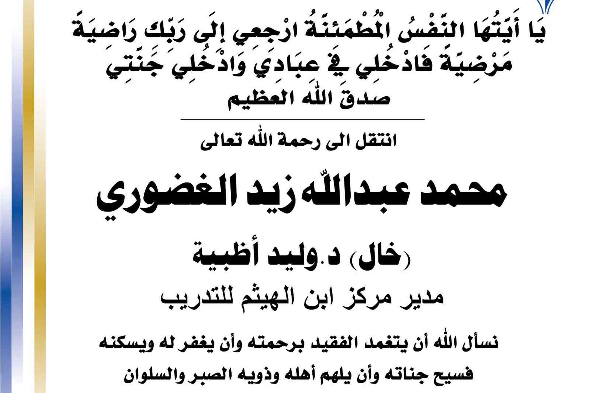 بسم الله الرحمن الرحيم يا آيتها النفس المطمئنة ارجعي الى ربك راضية مرضية فادخلي في عبادي وأدخلي جنتي صدق الله العظيم انتقل الى رحمه الله تعالى محمد عبدالله زيد الغضوري خال / د.وليد أظبية - مدير...
