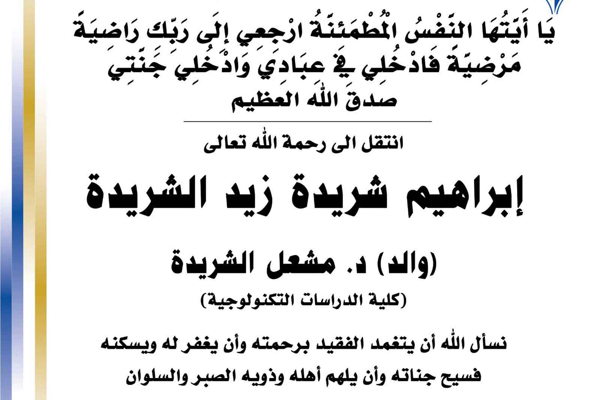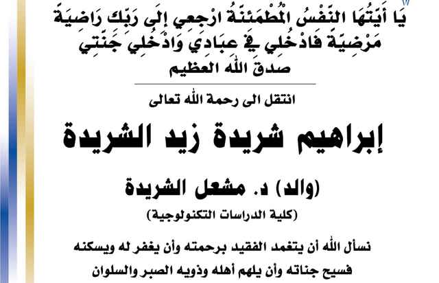 بسم الله الرحمن الرحيم يا آيتها النفس المطمئنة ارجعي الى ربك راضية مرضية فادخلي في عبادي وأدخلي جنتي صدق الله العظيم انتقل الى رحمه الله تعالى ابراهيم شريدة زيد الشريدة والد د.مشعل الشريدة كلية...