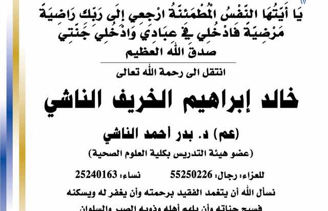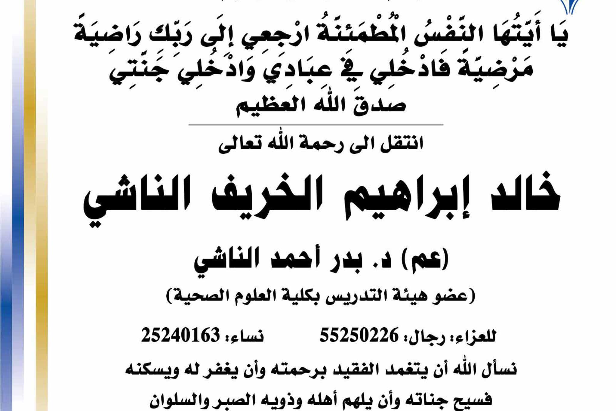 بسم الله الرحمن الرحيم يا آيتها النفس المطمئنة ارجعي الى ربك راضية مرضية فادخلي في عبادي وأدخلي جنتي صدق الله العظيم انتقل الى رحمه الله تعالى خالد ابراهيم الخريف الناشي عم/ د.بدر احمد الناشي -...
