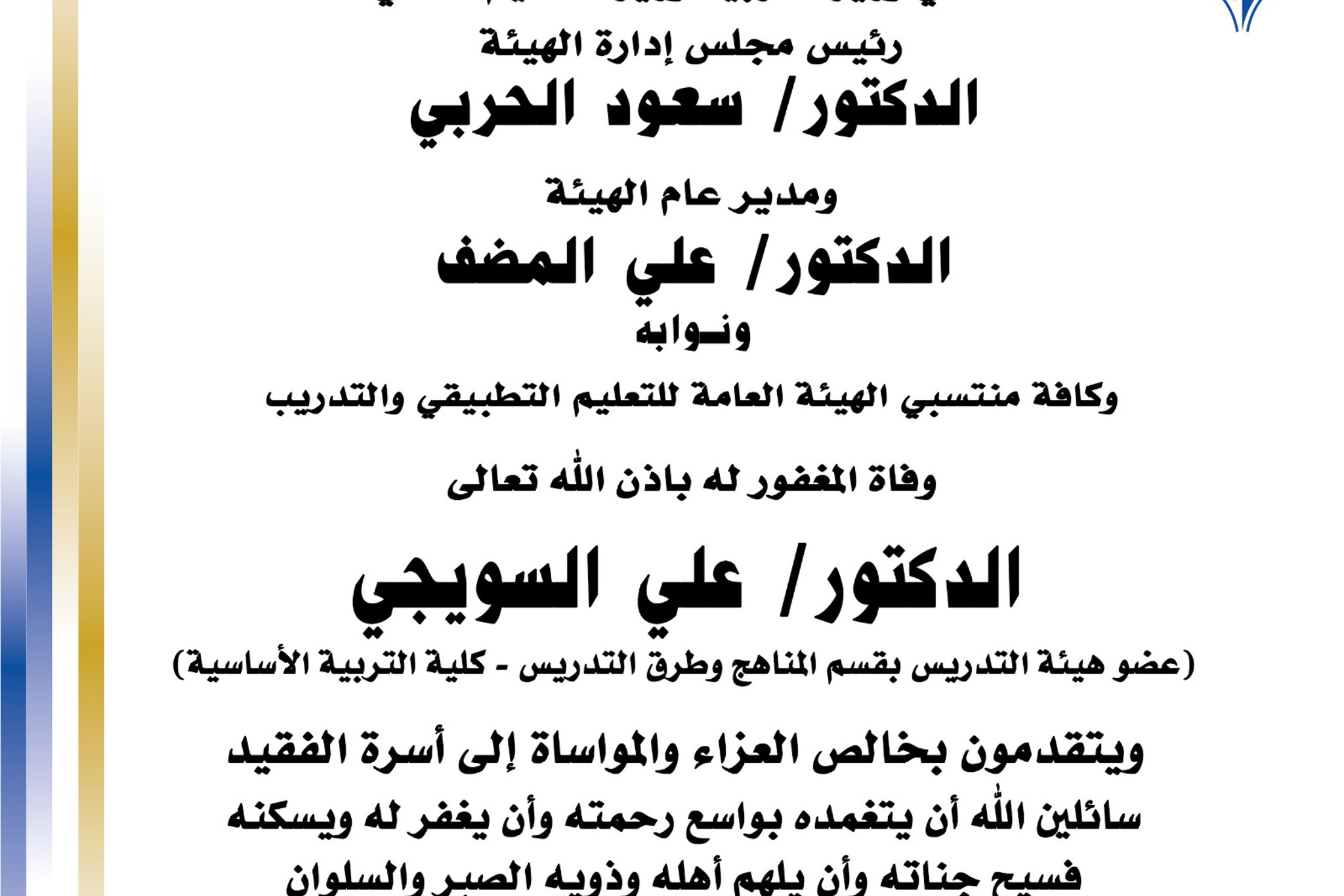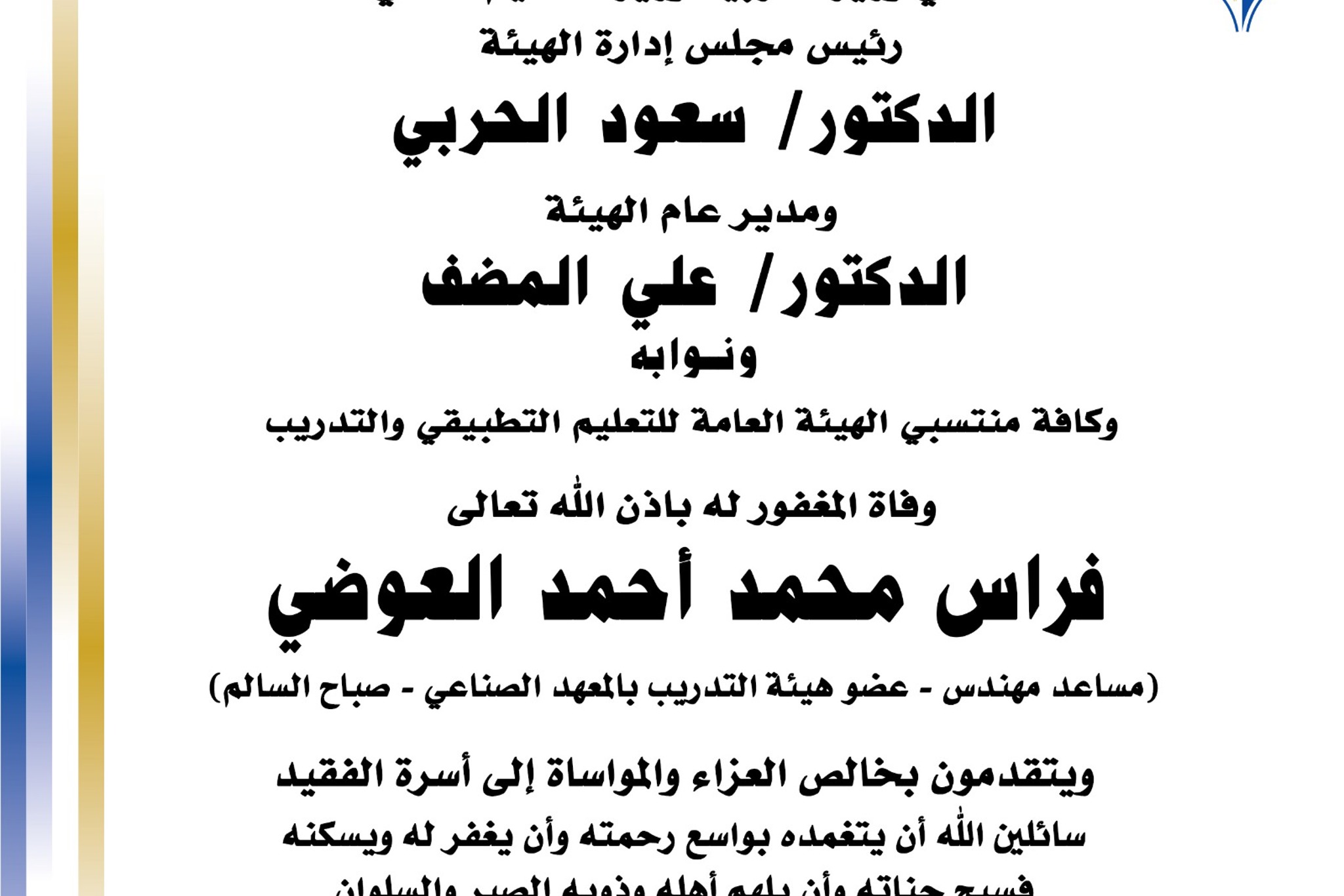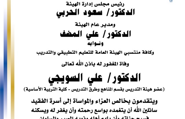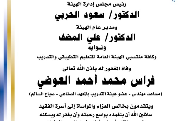 اعتمد مدير عام الهيئة العامة للتعليم التطبيقي والتدريب د.علي فهد المضف قرارا يقضي بترقية عدد (146) موظفا وموظفة بالاختيار الى الدرجة المبينة قرين اسم كل منهم والموضحة فيما يلي على ان يمنح المرقى اول مربوط الدرجة المرقى اليها مضافا اليها علاوة واحدة من علاواتها الدورية.