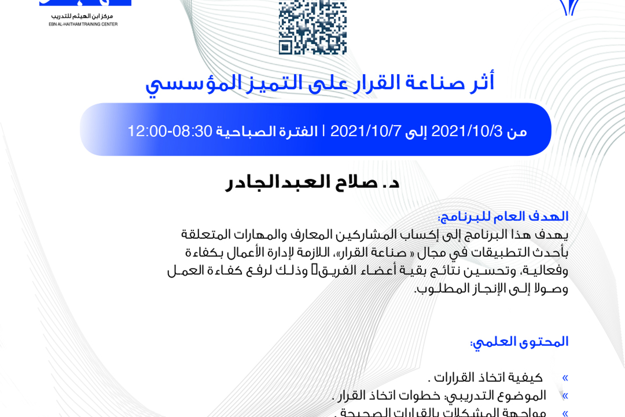 دورة أثر صناعة القرار على التميز المؤسسي للدكتور صلاح العبدالجادر في مركز ابن الهيثم للتدريب