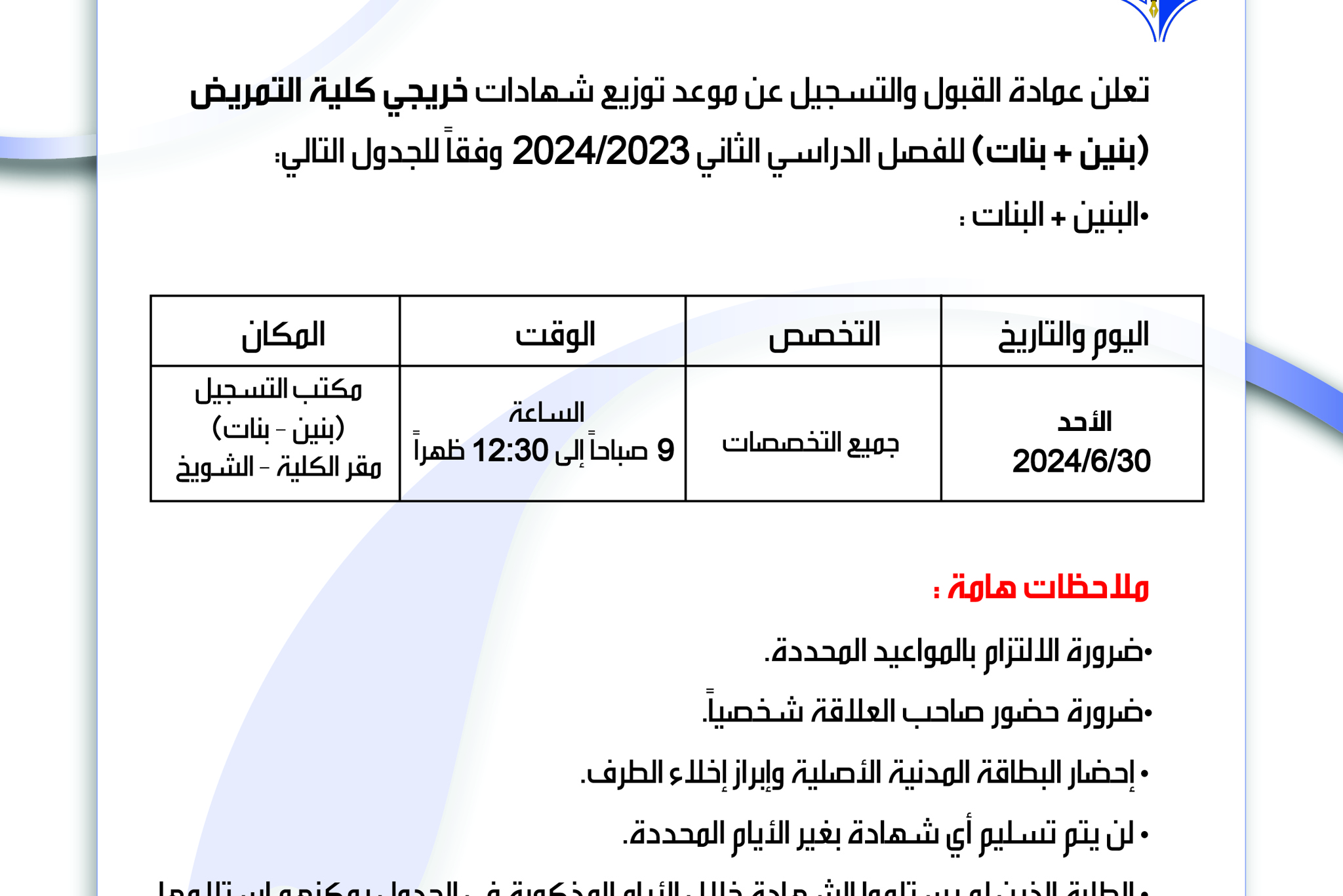 يعلن مكتب التدريب الميداني بالكلية عن بدء عملية التسجيل للتدريب الميداني للطلبة والطالبات. اضغط...