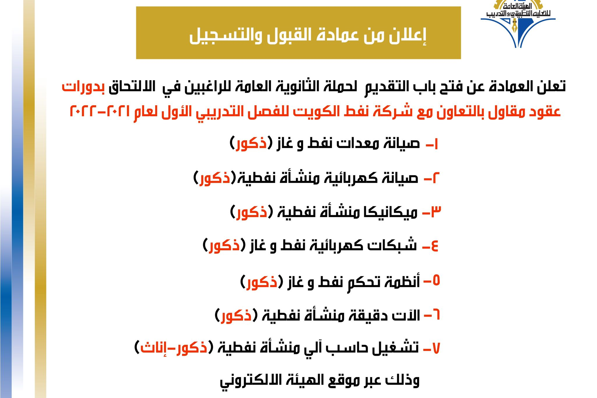 تعلن الهيئة العامة للتعليم التطبيقي والتدريب عن بدء تسجيل الراغبين في الالتحاق بمعاهد التدريب...