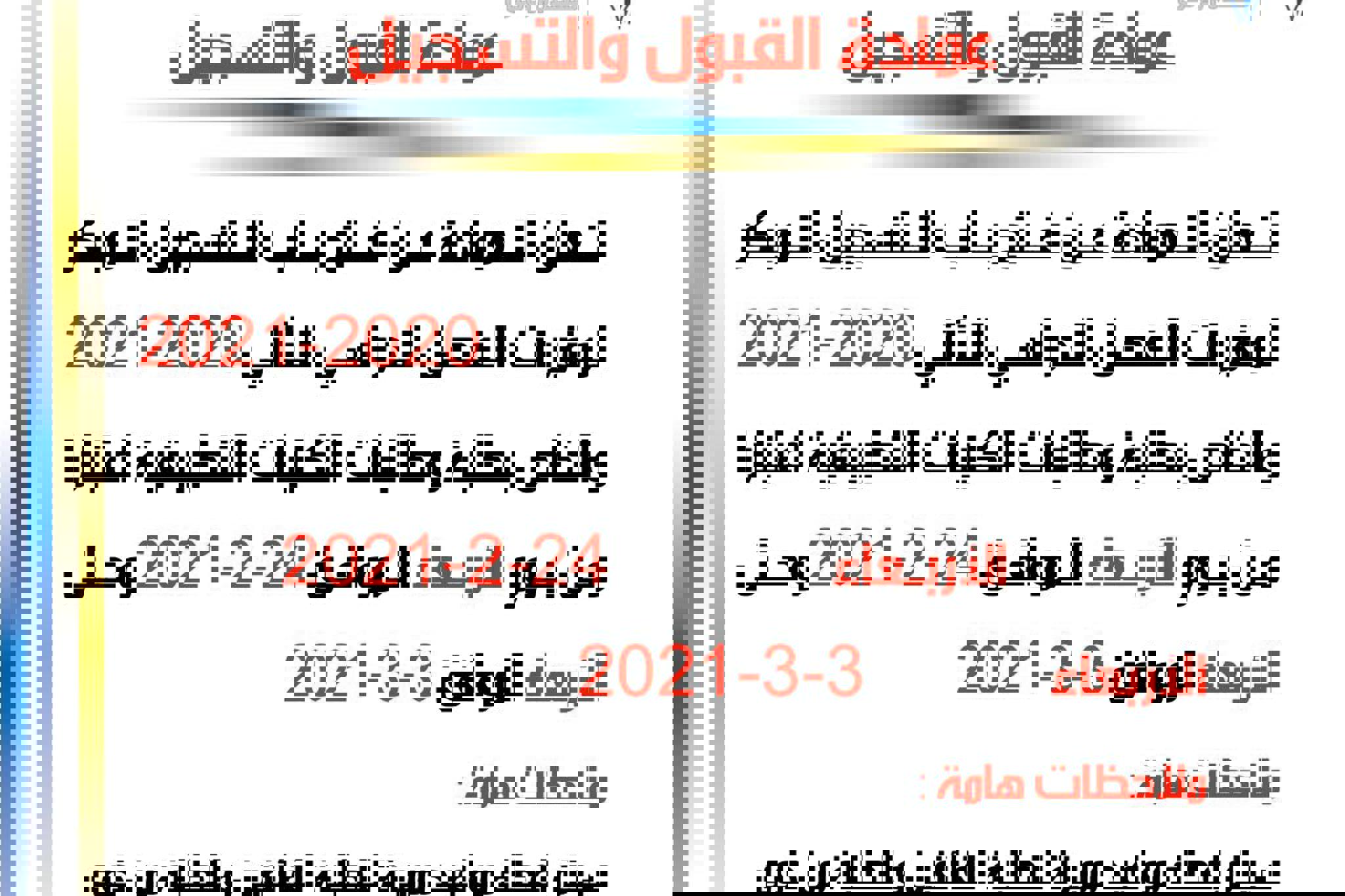 خاص بطلبة الكليات فتح التسجيل المبكر لمقررات الفصل الدراسي الثاني 2020-2021 اعتبارا من يوم...