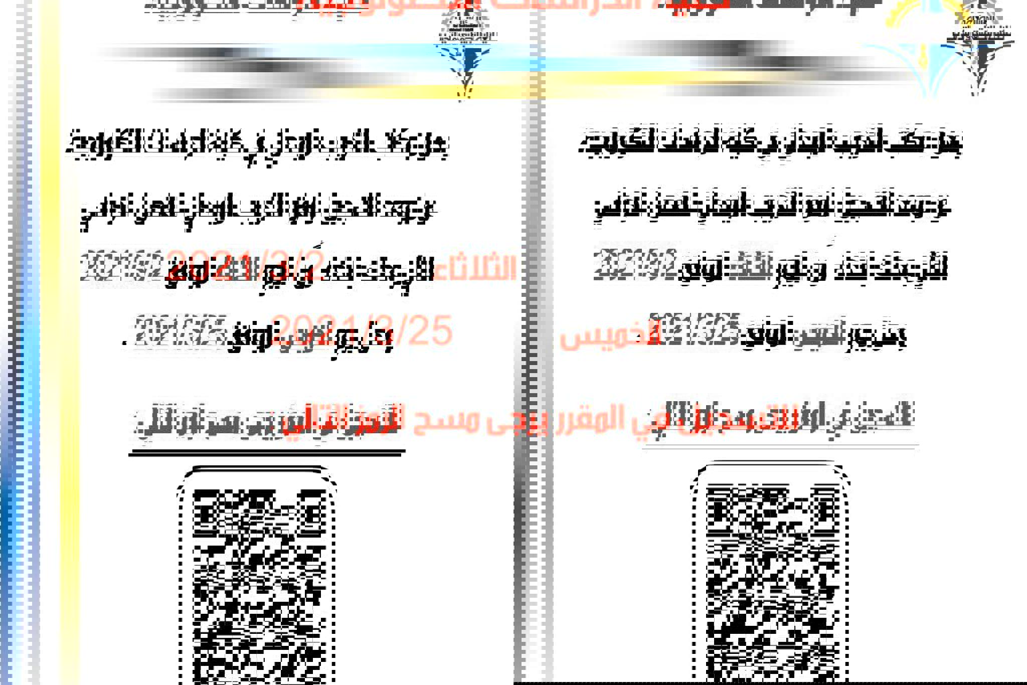 تعلن عمادة القبول والتسجيل عن بدء تسجيل الراغبين في الالتحاق بمعاهد التدريب للفصل التدريبي الثاني...