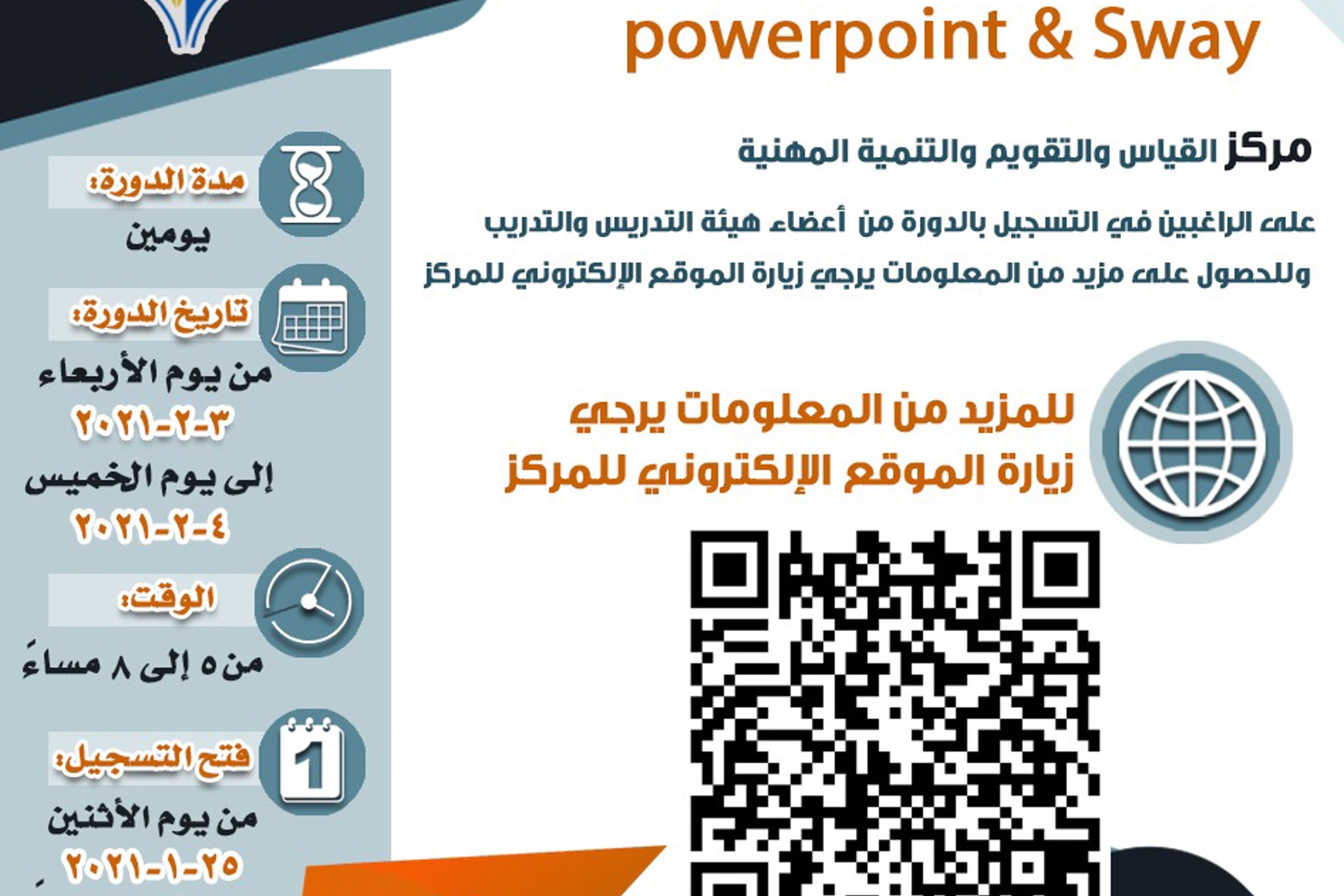 يعلن مركز القياس والتقويم والتنمية المهنية عن اقامة دورة أساسيات بناء وانجاز الدروس التفاعلية...