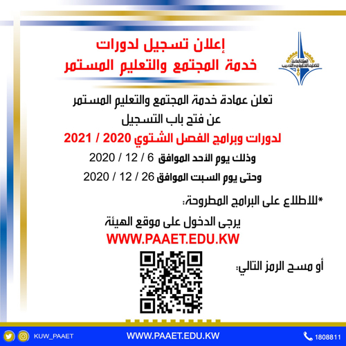 تعلن عمادة خدمة المجتمع والتعليم المستمر عن دوراتها للفصل الربيعي للعام 2020-2021 حيث يبدأ...