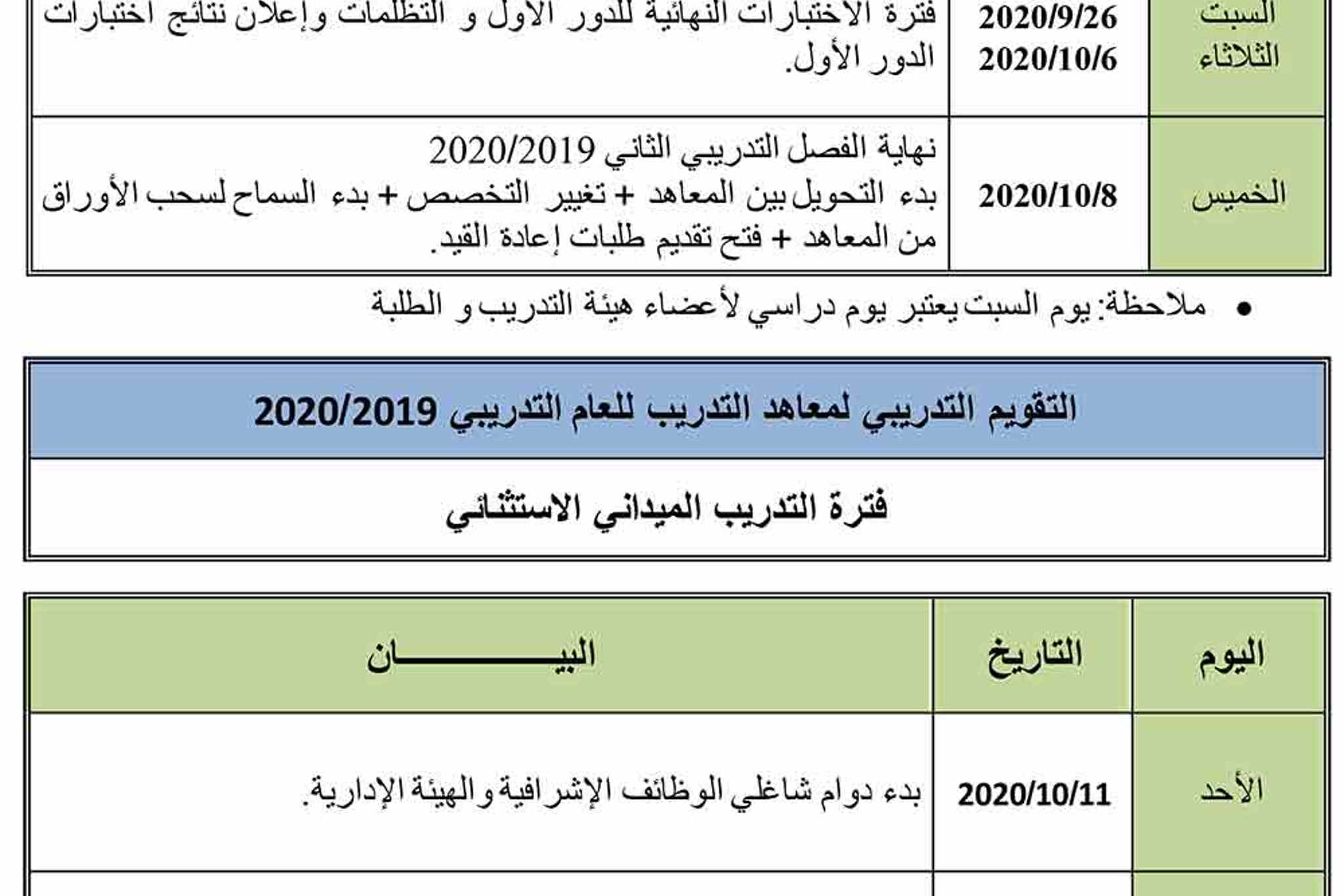 التقويم التدريبي لمعاهد التدريب للعام التدريبي 2019/2020 ( الفصل التكميلي الثاني - فترة التدريب...