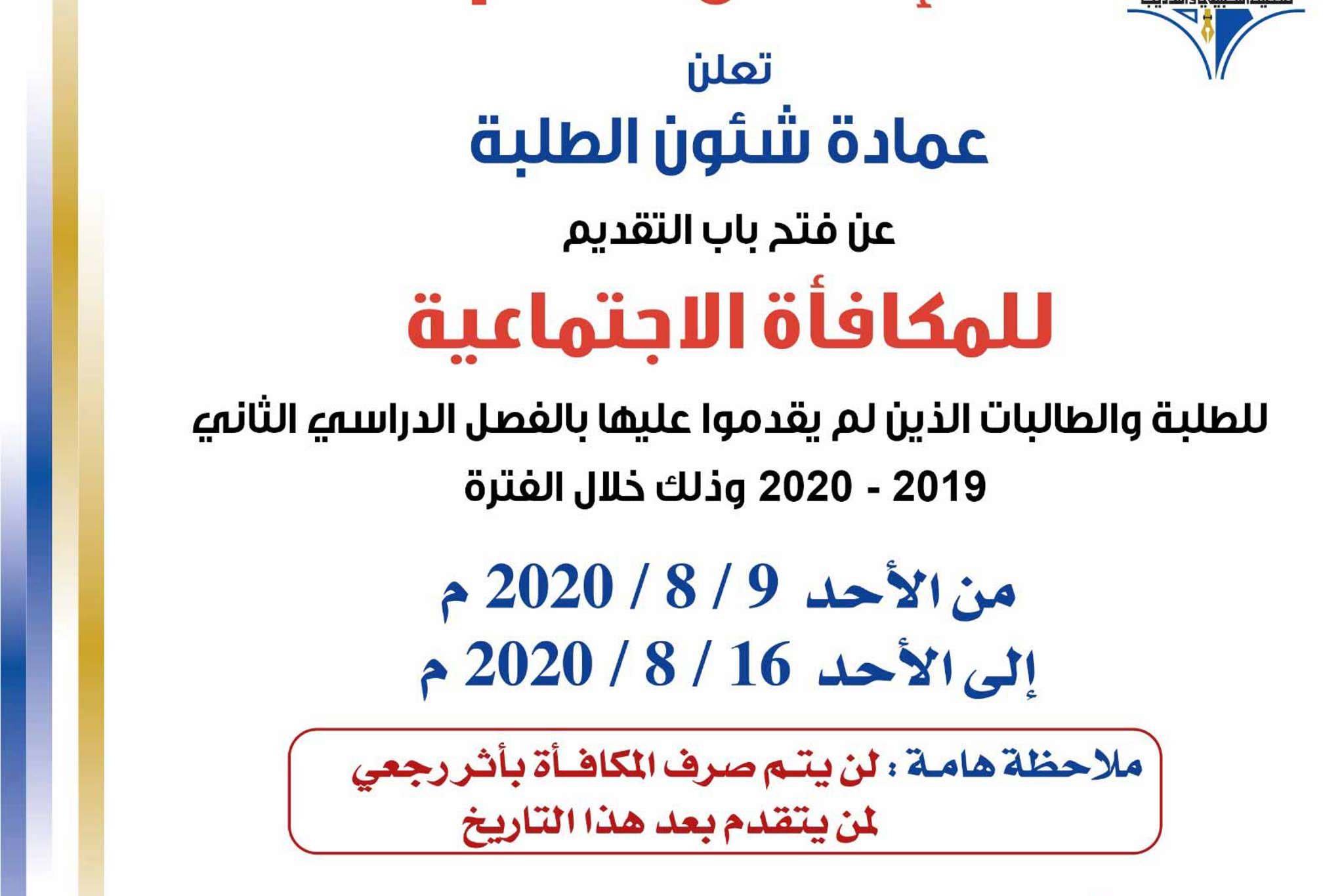 تعلن عمادة شئون الطلبة عن فتح باب التقديم للمكافاة الاجتماعية للطلبة والطالبات الذي لم يقدمو...