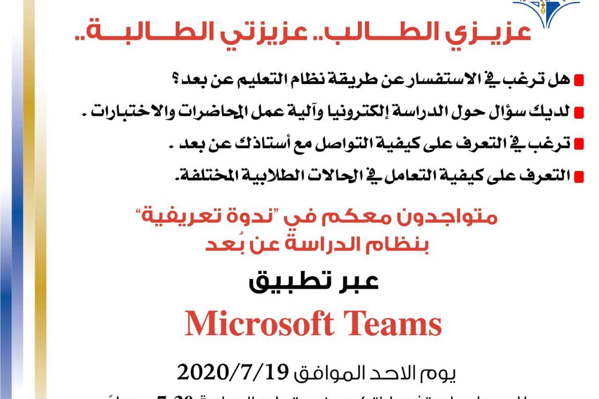 ندوة تعريفية بنظام الدراسة عن بعد عبر تطبيق مايكروسوفت وذلك يوم الاحد الموافق 19 يوليو 2020 في...