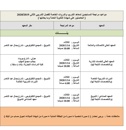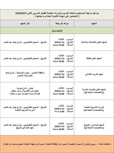مواعيد مراجعة المستجدين لمعاهد التدريب والدروات الخاصة للفصل التدريبي الثاني 2019/ 2020 (...