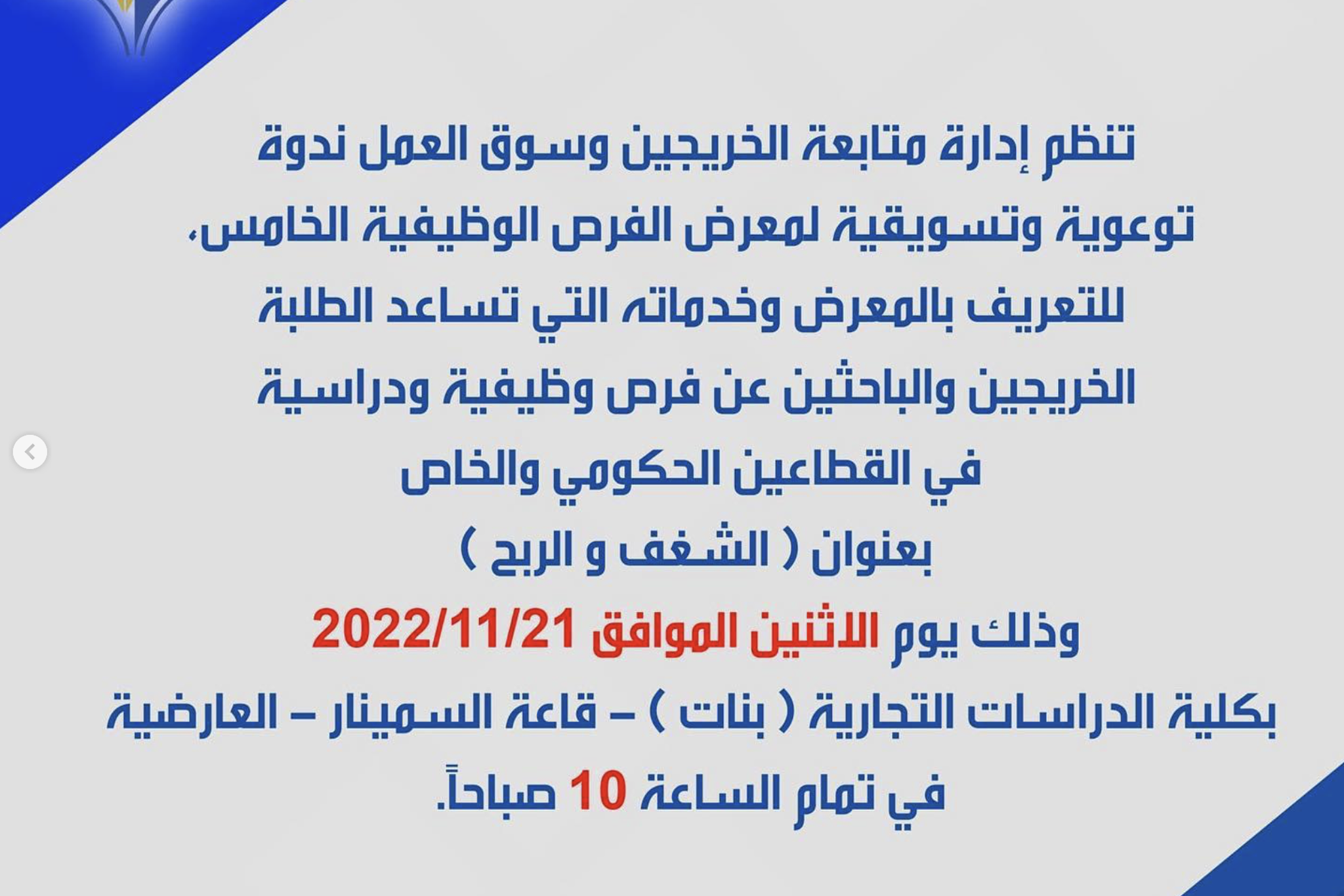 تنظم ادارة متابعة الخريجين وسوق العمل ندوة توعوية وتسويقية لمعرض الفرص الوظيفية الخامس.