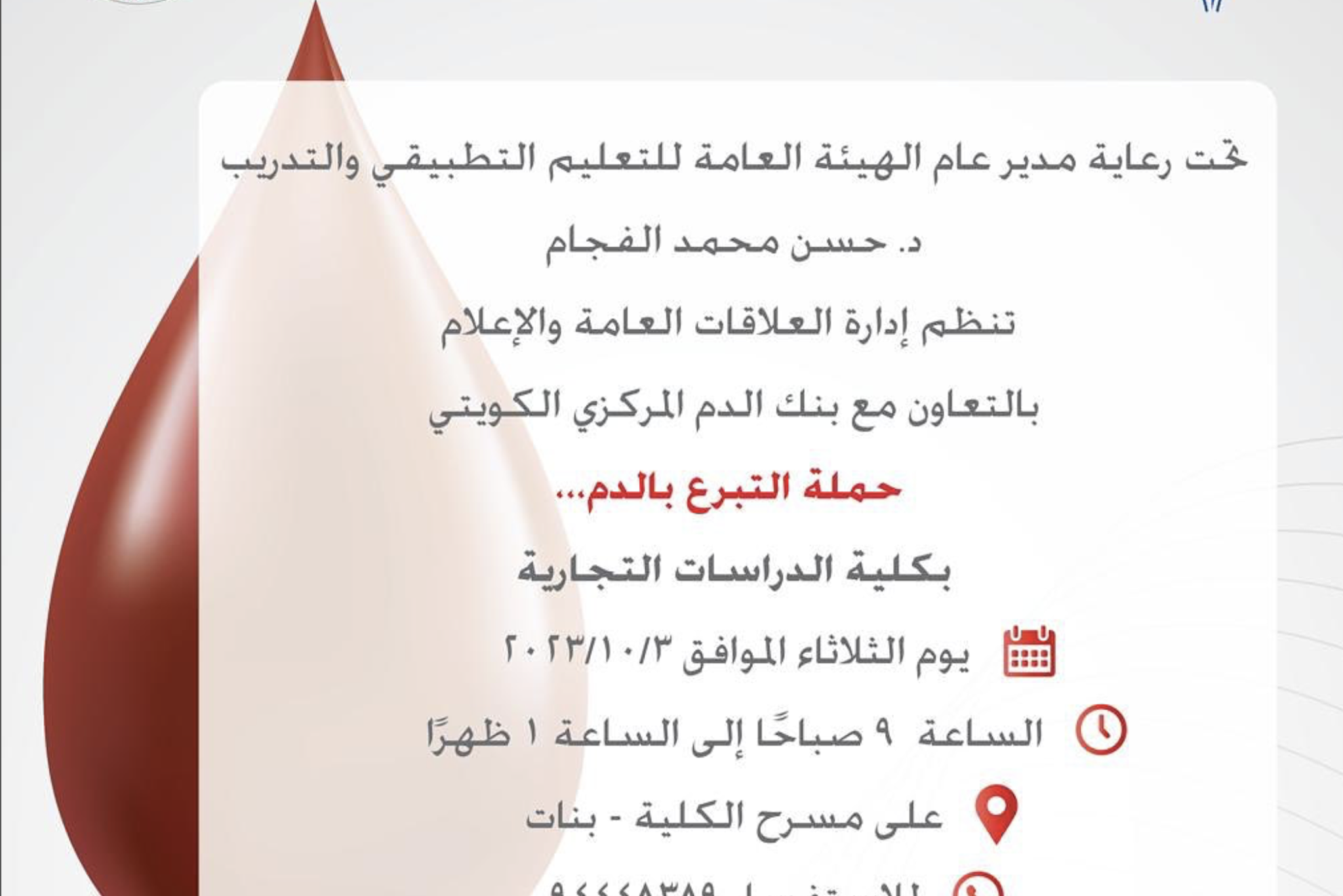 تحت رعاية مدير عام الهيئة العامة للتعليم التطبيقي والتدريب د.حسن محمد الفجام ، تنظم إدارة العلاقات العامة والاعلام بالتعاون مع بنك الدم المركزي الكويتي.