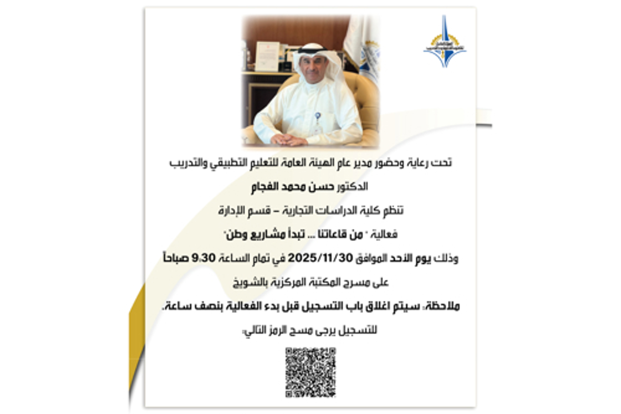 برعاية مدير عام الهيئة العامة للتعليم التطبيقي والتدريب د.حسن الفجام يدعوكم عميد كلية الدراسات التجارية د.فارس الحيان.