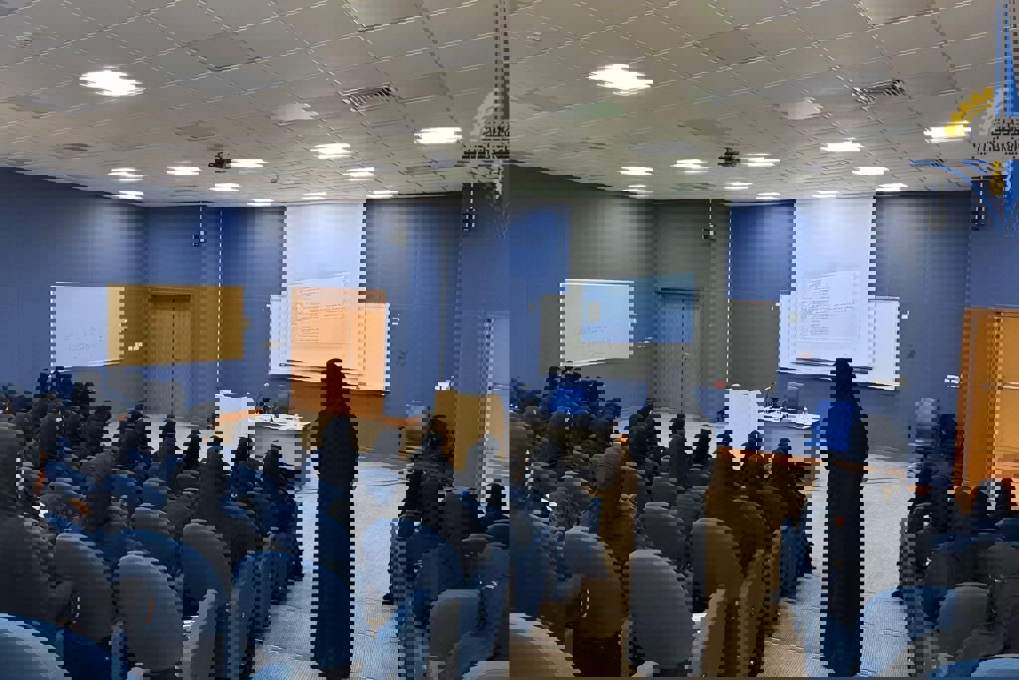 هدف اللقاء تعريفهن بالقوانين واللوائح والعمل المعمول بها في الكلية، وآلية التسجيل، وطبيعة المواد التخصصية.