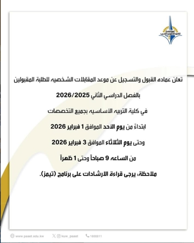 موعد المقابلات الشخصية للطلبة المقبولين للفصل الدراسي الثاني 2025/2026