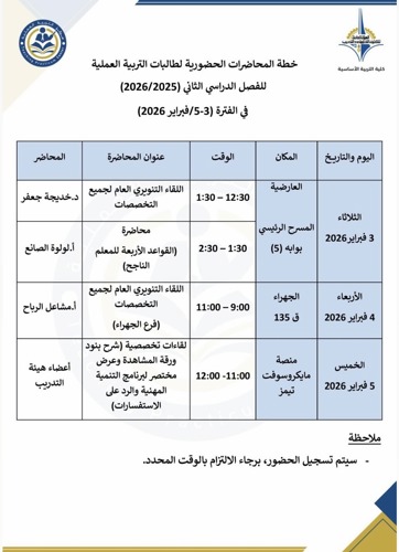 خطة المحاضرات الحضورية لطالبات التربية العملية للفصل الدراسي الثاني 2025/2026