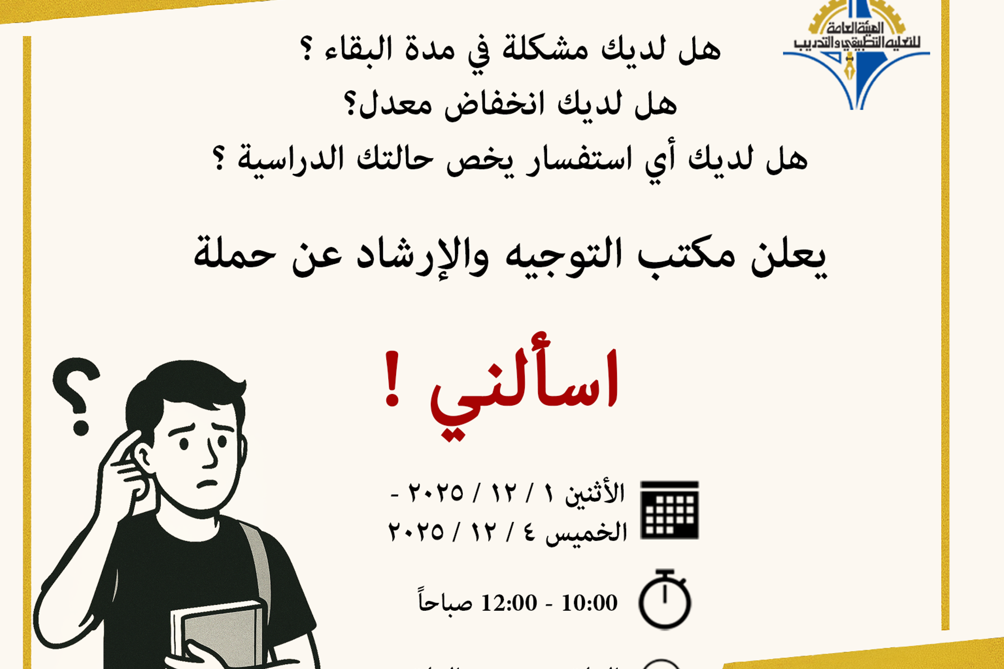 نظم مكتب التوجيه والإرشاد في كلية التمريض – بنين /بنات فعالية (اسألني) التي جاءت بهدف دعم الطلبة و الطالبات والإرتقاء بوعيهم الأكاديمي.