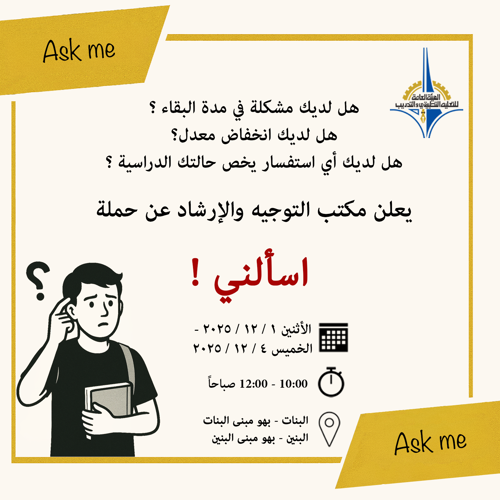 يعلن مكتب التوجيه و الارشاد في كلية التمريض عن حملة بعنوان (اسألني) للطلبة و الطالبات