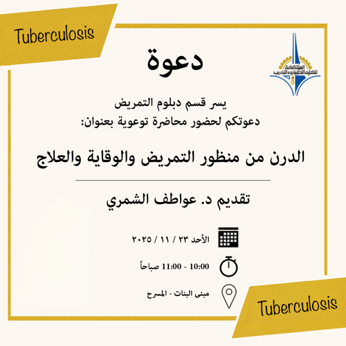 يسر قسم دبلوم التمريض دعوتكم لحضور محاضرة توعوية بعنوان( الدرن من منظور التمريض و الوقاية والعلاج...