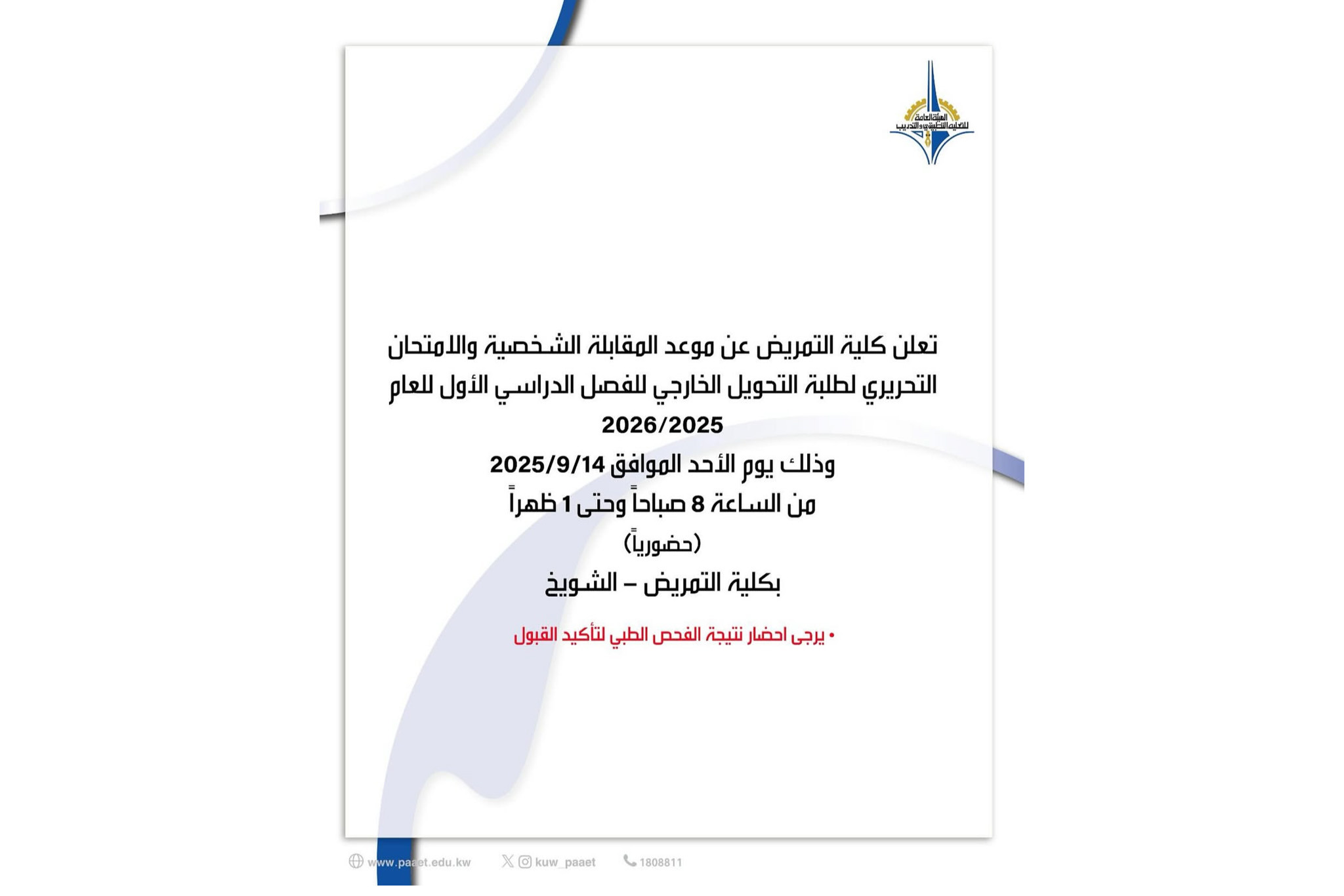 تعلن كلية التمريض عن المقابلة والامتحان التحريري لطلبة التحويل