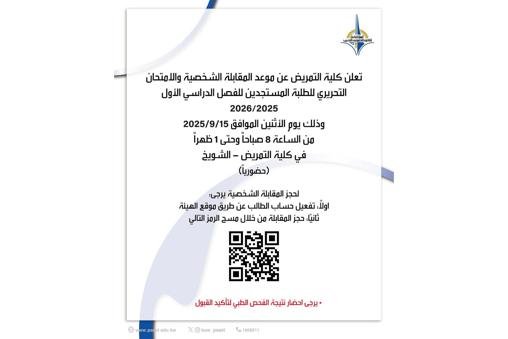تعلن كلية التمريض عن موعد المقابلة الشخصية والامتحان التحريري