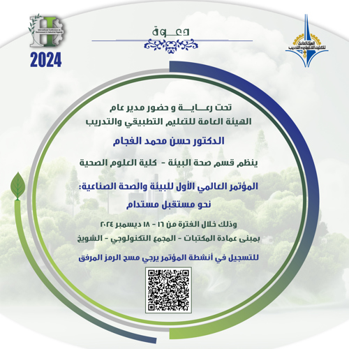 تحت رعــــايــــة و حضور مدير عام الهيئة العامة للتعليم التطبيقي والتدريب الدكتور / حسن محمد الفجام ، ينظم قسم صحة البيئة المؤتمر العالمي الأول للبيئة والصحة الصناعية: نحو مستقبل مستدام وذلك خلال الفترة من 16 - 18 ديسمبر 2024 بمبنى عمادة المكتبات - المجمع التكنولوجي - الشويخ