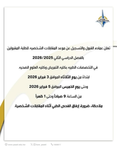 موعد المقابلات الشخصية للطلبة المقبولين للفصل الدراسي الثاني 2025/2026