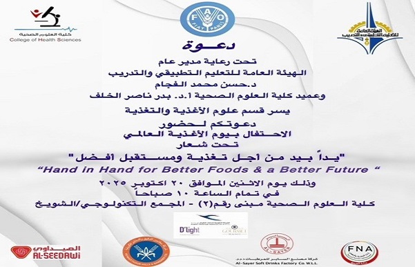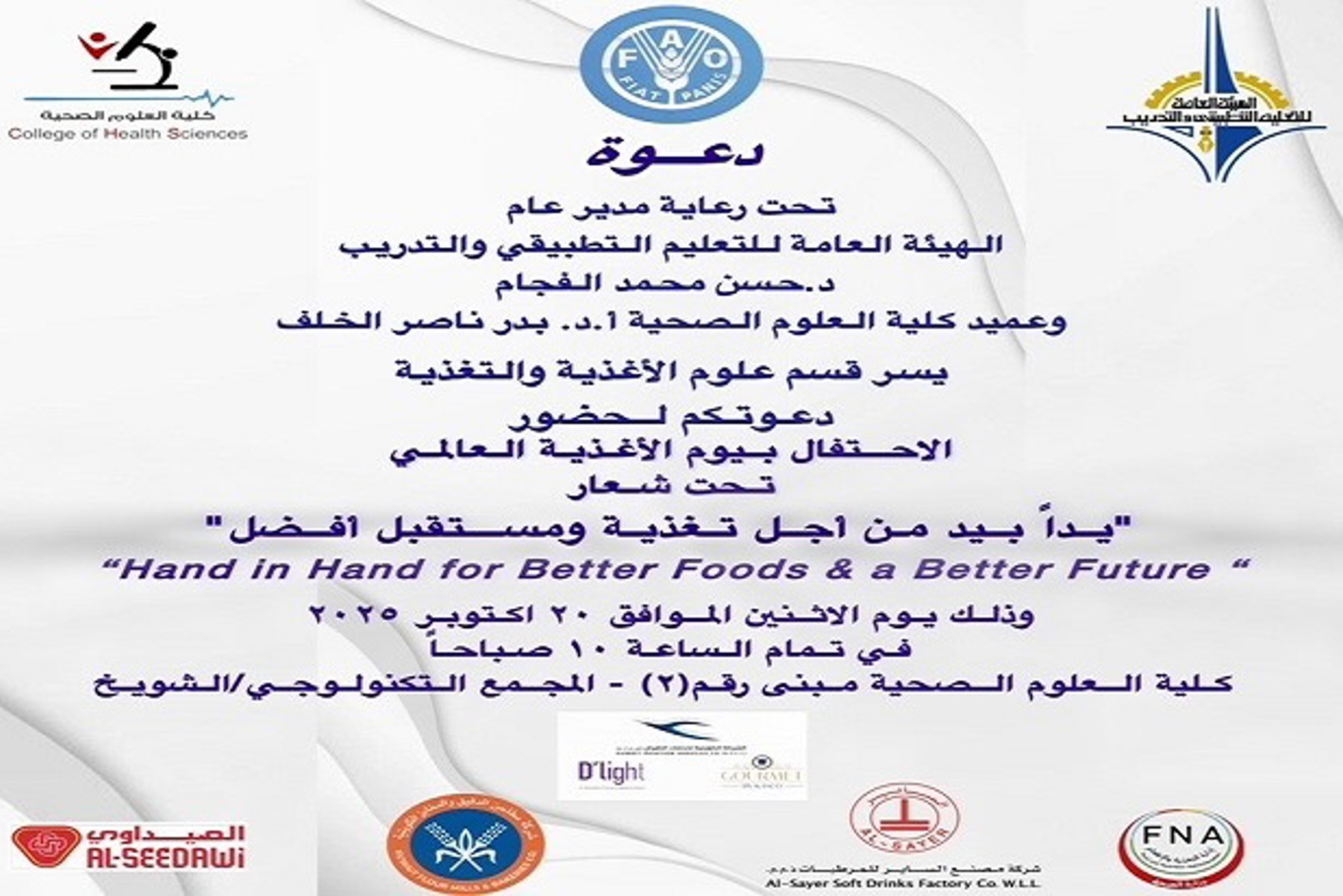 يسر قسم علوم الأغذية والتغذية دعوتكم بحضور الاحتفال بيوم الأغذية العالمي تحت شعار يداً بيد من أجل تغذية ومستقبل أفضل