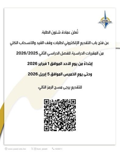 إعلان من عمادة شئون الطلبة عن "فتح باب التقديم الالكتروني لطبات وقف القيد والانسحاب الكلي للفصل الدراسي الثاني 2025/2026"