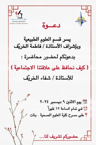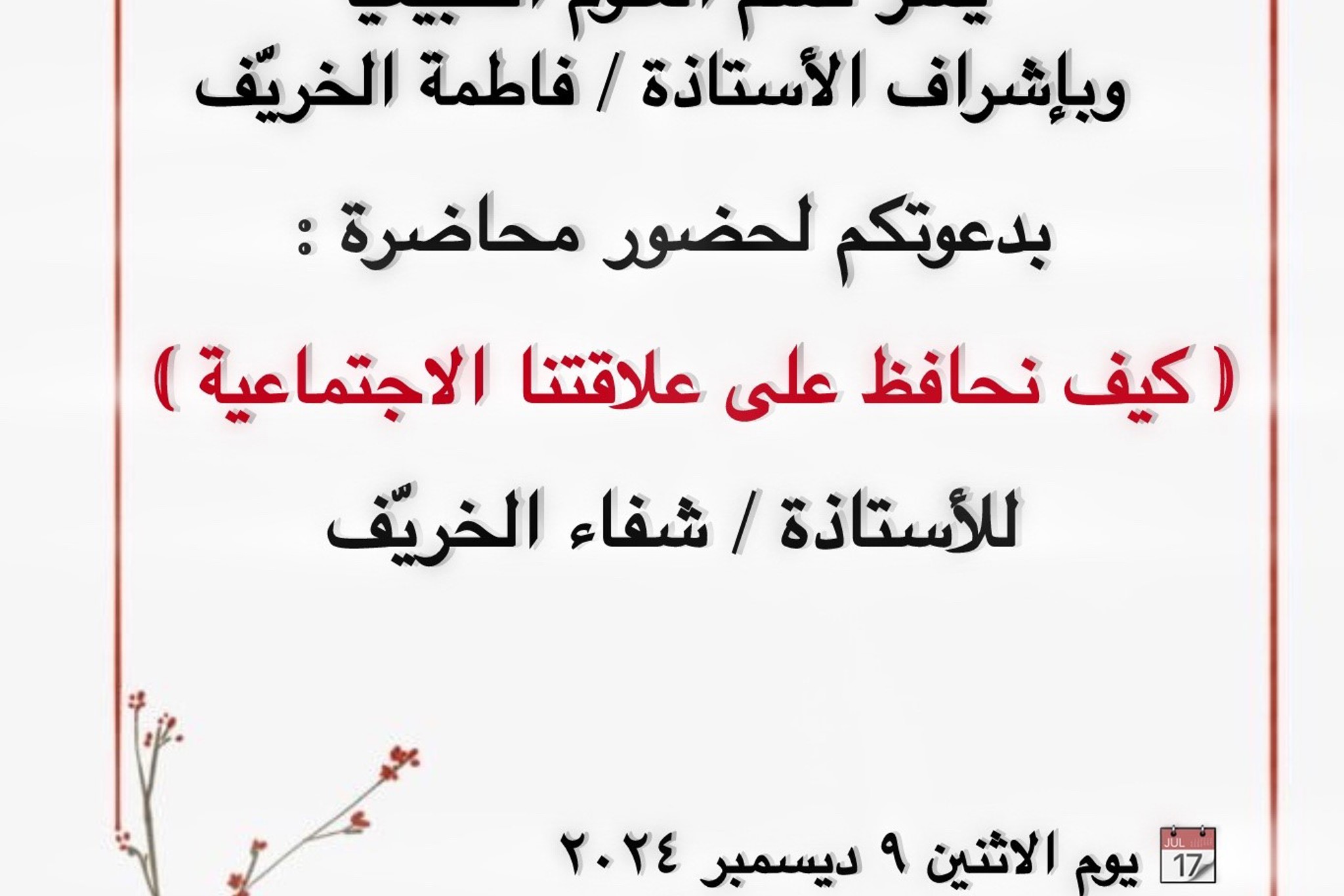 يسر قسم العلوم الطبيعية بدعوتكم لحضور محاضرة كيف نحافظ على علاقتنا الاجتماعية