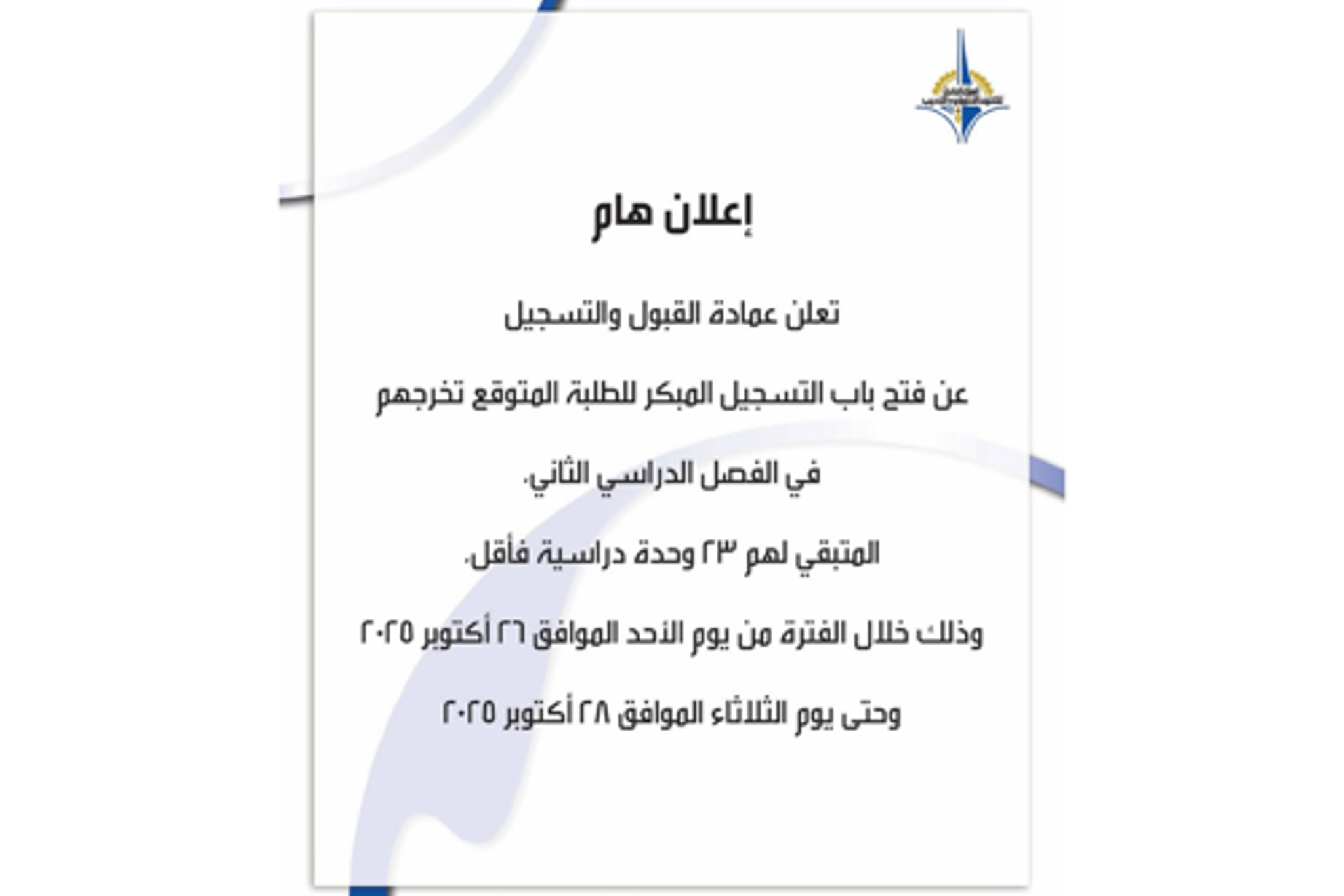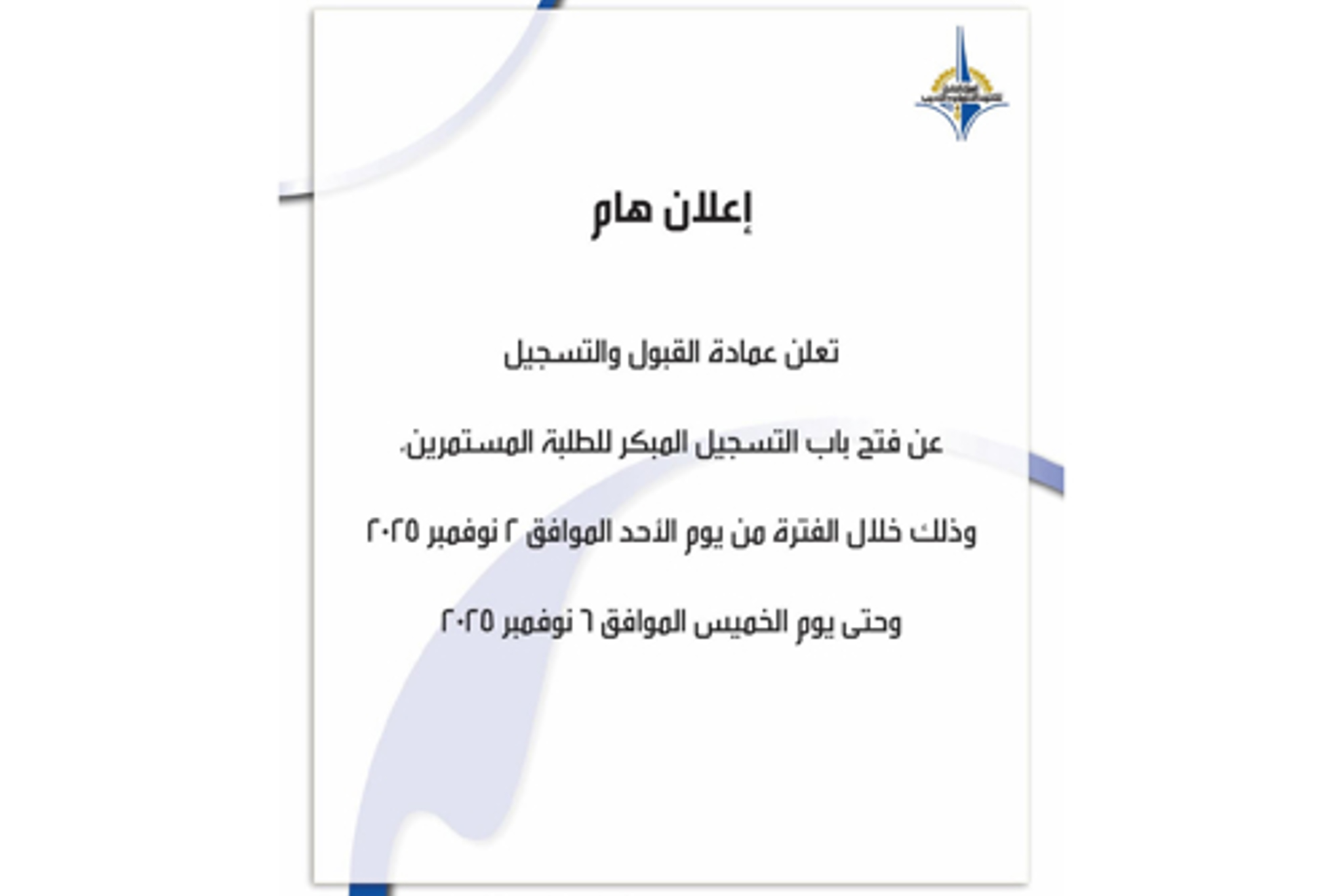 إعلان من عمادة القبول والتسجيل "فتح باب التسجيل المبكر للطلبة المستمرين"