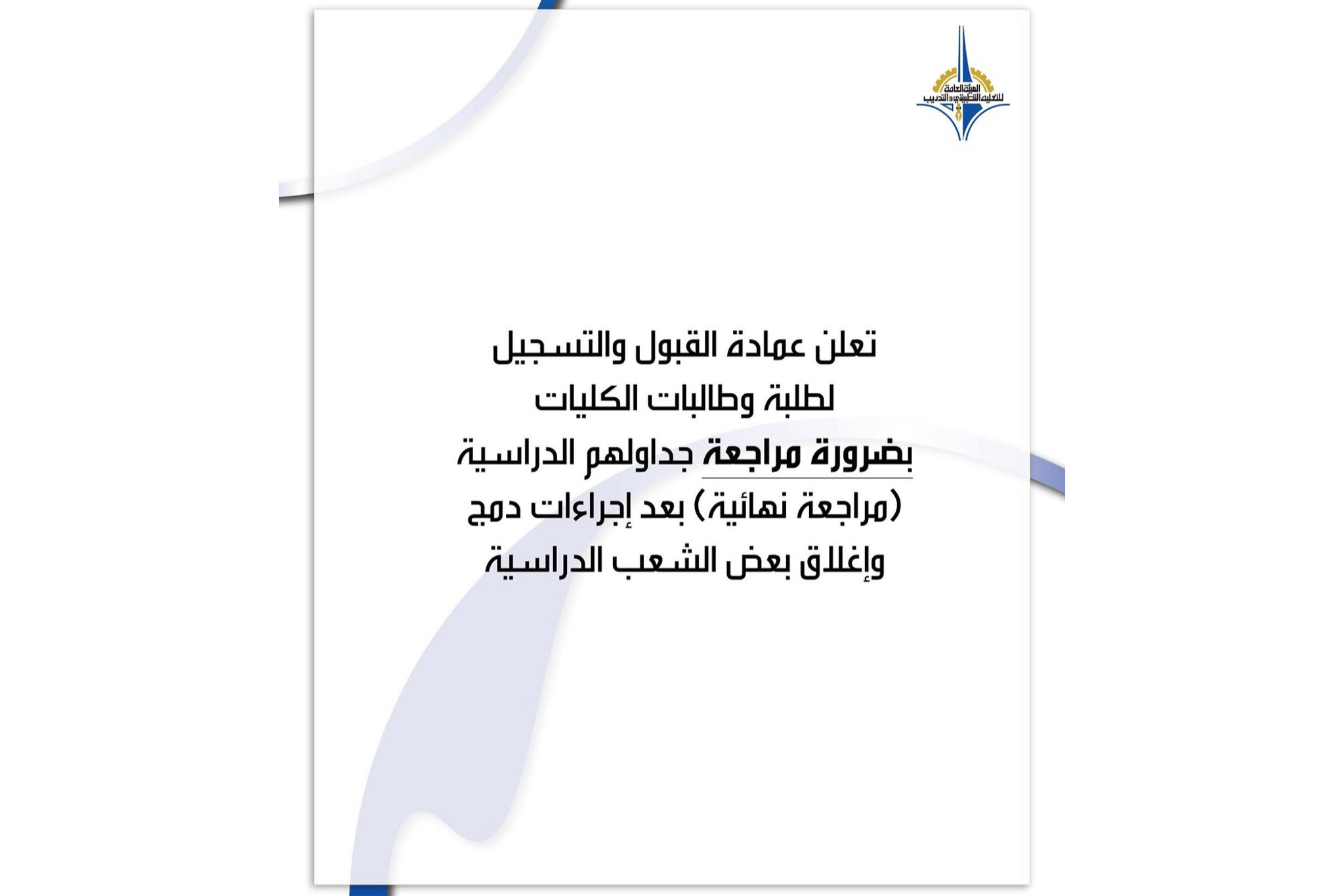 تعلن عمادة القبول والتسجيل لطلبة وطالبات الكليات بضروره مراجعة جدوالهم الدراسيه
