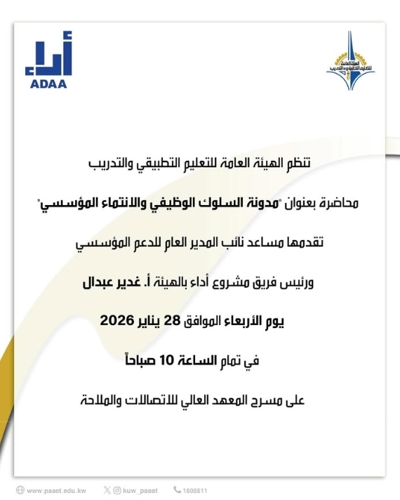 تنظم الهيئة العامة للتعليم التطبيقي و التدريب محاضرة بعنوان" مدونة السلوك الوظيفي والانتماء المؤسسي"