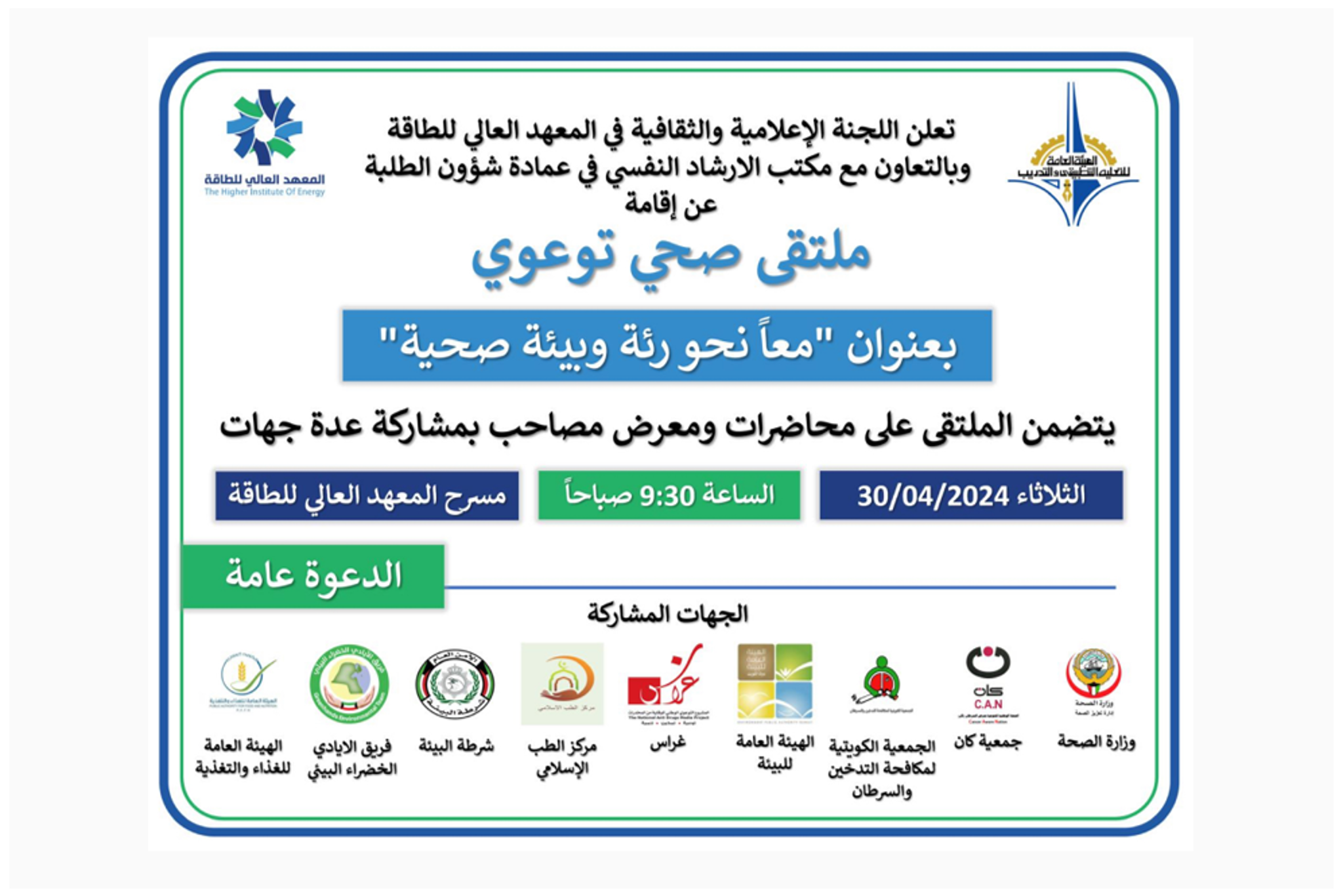 اقام المعهد العالي للطاقة بالتعاون قسم الارشاد النفسي في عمادة شئون الطلبة ملتقى صحي توعوي بعنوان (معا نحو رئة ..وبيئة صحية)