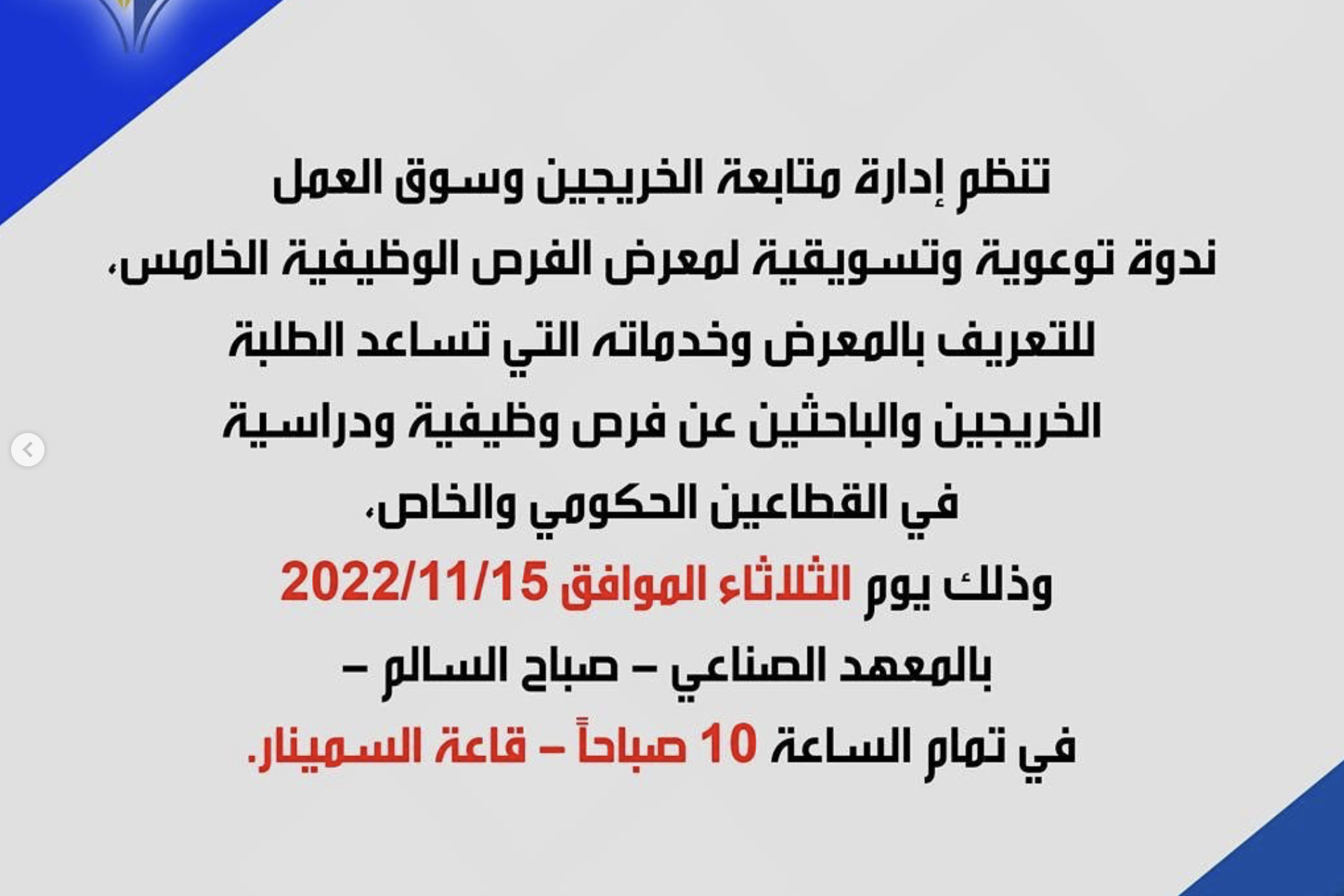 ندوة توعوية وتسويقية لمعرض الفرص الوظيفية الخامس تنظم إدارة متابعة الخريجين وسوق العمل ندوة توعوية وتسويقية لمعرض الفرص الوظيفية الخامس في المعهد.